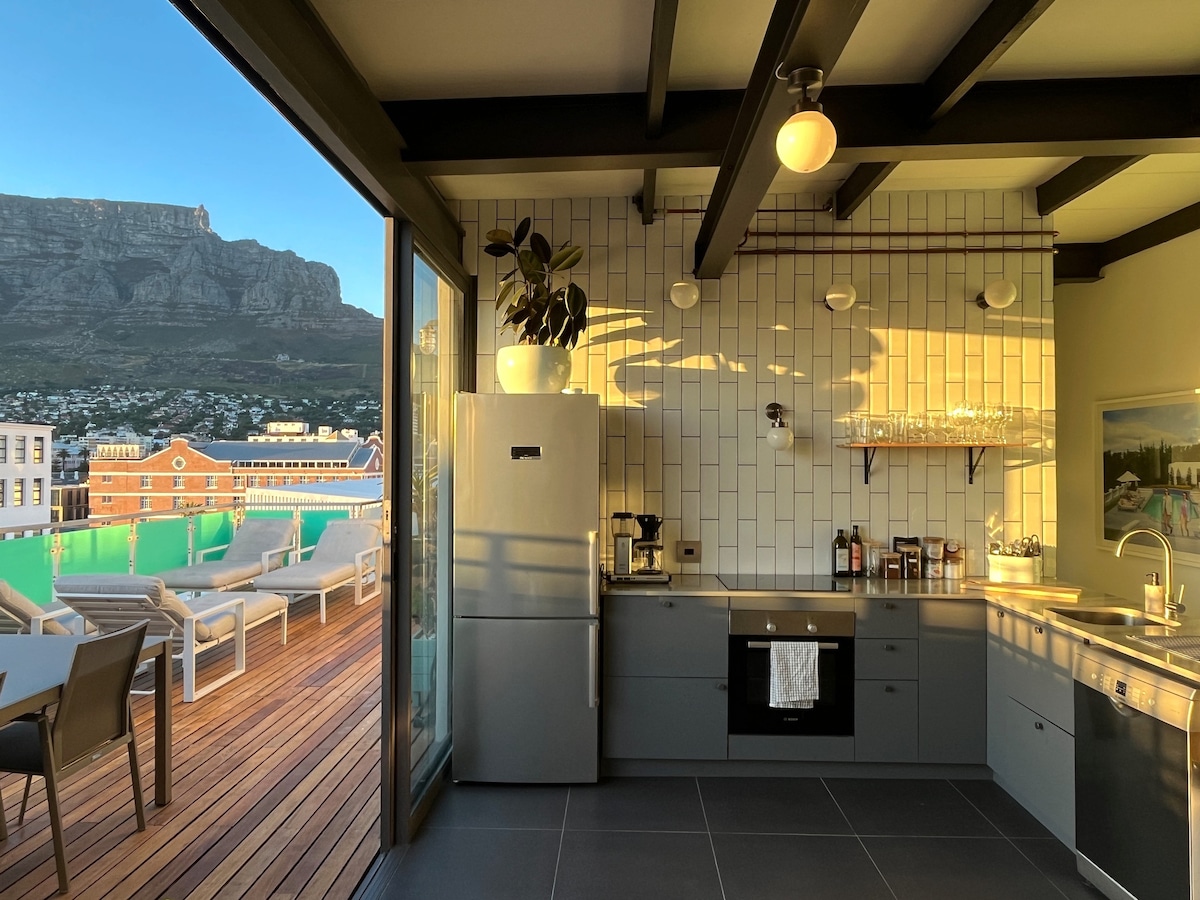 Newly renovated in 2025 with a private pool (heated mid October to mid May) with a big terrace and views for life! 100 mbps Internet. 3 bedrooms, 3 bathrooms. Work on remote or enjoy a vacation, this spot is ideal for both! Located on top of Bree Street this penthouse is one of a kind. It boasts an amazing terrace and a private pool overlooking Table Mountain. Close to all trendy restaurants and Waterfront/ the beaches just 10 min away. 24 h security and 2 private garage parkings included.