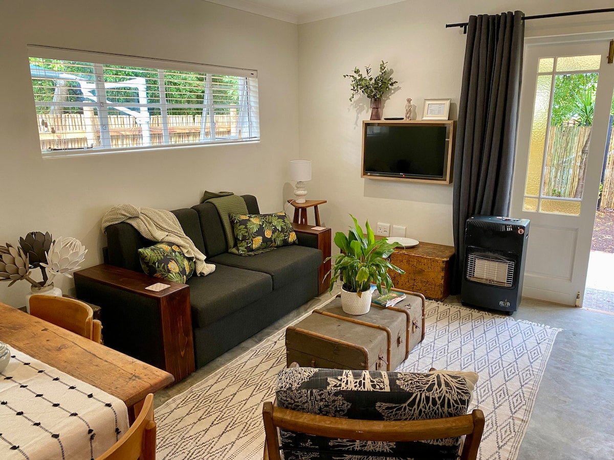 Relax in this stylish, modern, solar-powered loft in Mostertsdrift, Stellenbosch's prime neighbourhood. The open-plan kitchen, cozy living area, and private balcony with stunning mountain views to enjoy your morning coffee or a glass of wine, is perfect for up to three guests. Just a short walk from Lanzerac Wine Estate and close to cafes, shops, and dining spots. Enjoy scenic hikes or mountain biking in Jonkershoek Nature Reserve, wine tasting, or simply unwind—everything is at your doorstep!