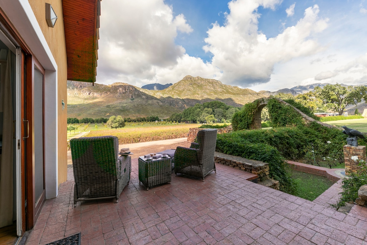 Luxuriously appointed self-catering house near the manor house. Perfect for honeymooners and small families. Large swimming pool and Jacuzzi with splendid mountain and vineyard views. A big warm fireplace for the colder months! A continental breakfast is served with all our accommodation and we offer, by appointment, complimentary cheese and wine pairings at our own boutique cellar.