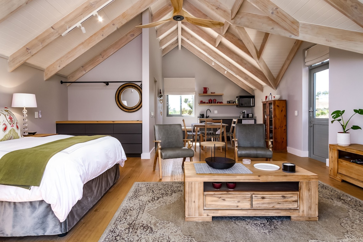 A beautiful open plan guest apartment in the Winelands.It has magnificent views ,is beautifully furnished and is quiet and peaceful.There is a kitchenette( microwave,no oven)en suite bathroom( shower only)dining area and balcony.It’s airy & light.Guests are able to walk on the farm to stretch their legs and take in the beautiful views and fresh air or watch the zebras,springbok and wildebeest in the game camp. It is Located 7 km from the town center of Stellenbosch
