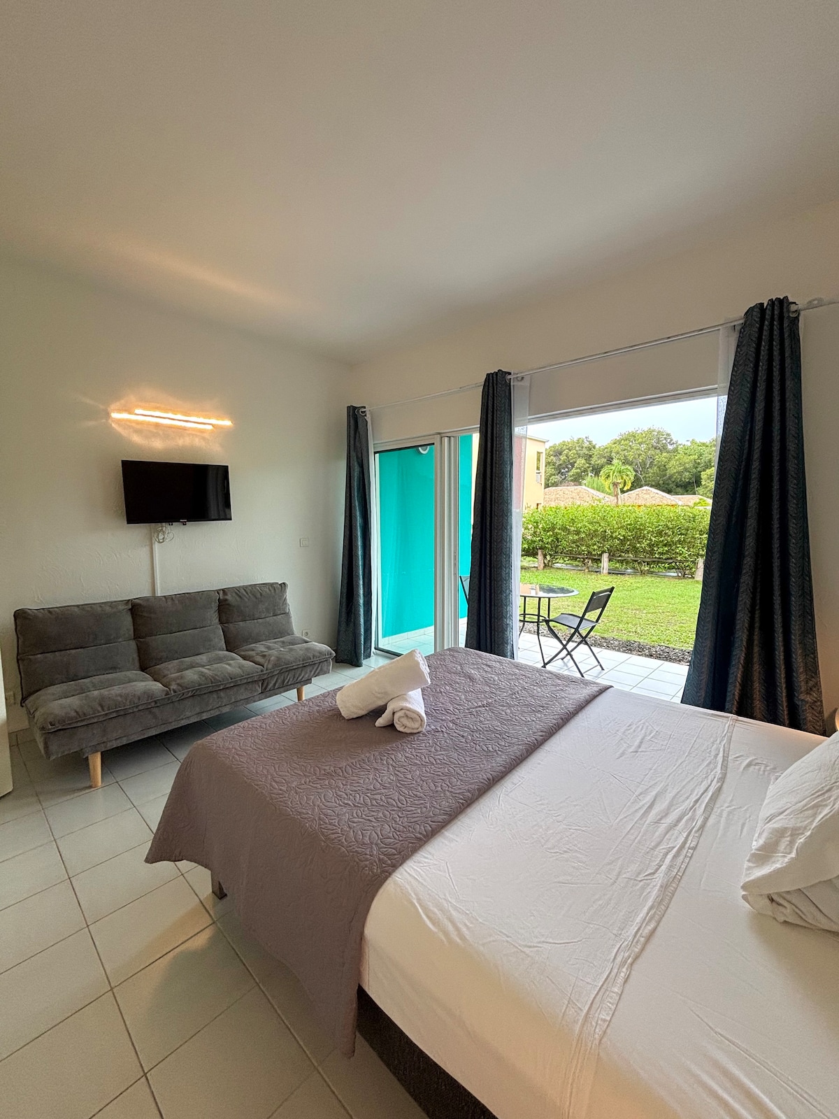 🌴 Bienvenue à La Marigalantine Situé dans le village Kawann, calme et sécurisé, le bungalow La Marigalantine bénéficie d'une proximité à la plage accessible à pied en poussant le portail du site. Moderne et décoré avec goût, il est idéal pour des vacances en couple et offre le confort et les équipements indispensables pour un séjour réussi ! Il dispose d’une terrasse bien exposée avec vue sur jardin tropical et permet de rejoindre la piscine du complexe en moins d'une minute.