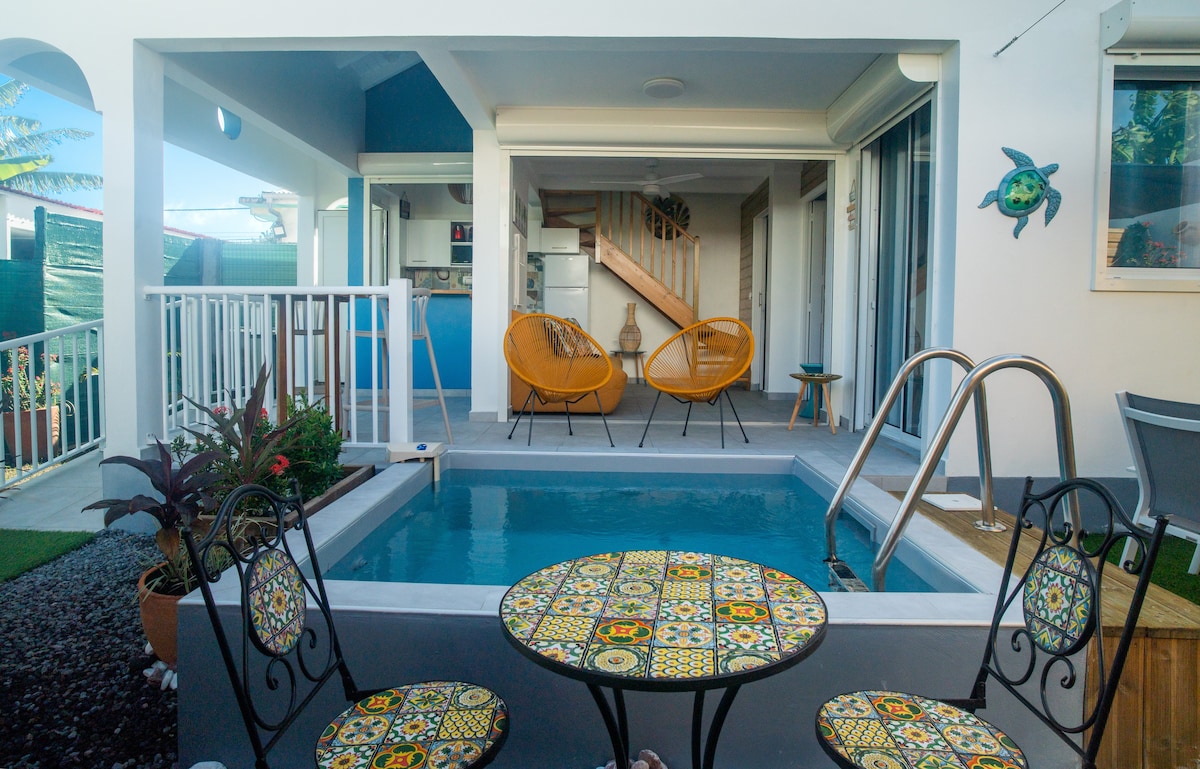 Case créole avec vue sur le lagon, 2 chbres climatisées et piscine. A 5mn à pied de la plage, profitez des commerces du bourg sur votre chemin. A 5 mn en voiture ou en vélo, la côte Est délivre avec vitalité ses plages sauvages et peu fréquentées. Près d'une dizaine de restaurants à proximité proposent une cuisine variée, entre les plats purement locaux du Touloulou et de la Source, les crêpes de Valérie et la cuisine raffinée de la Playa.