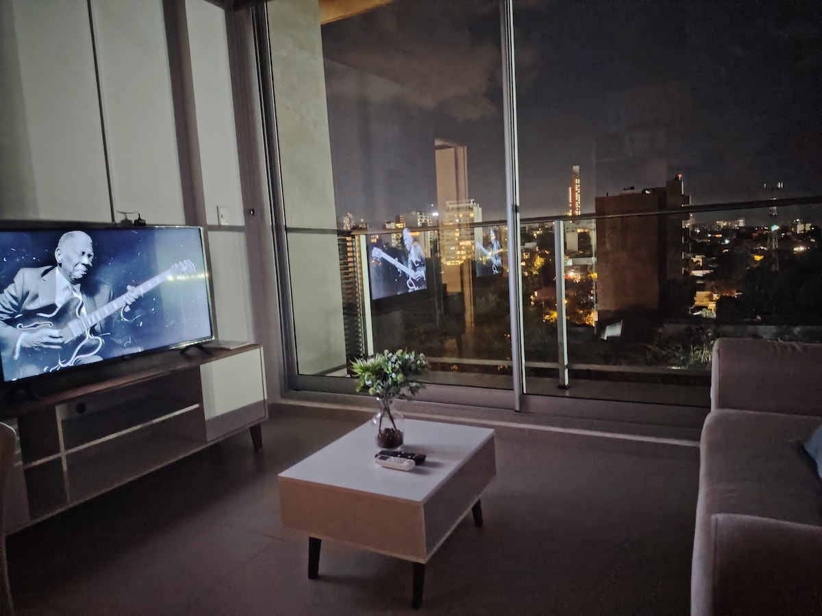 Espectacular apartamento ubicado cerca del corazón del centro de negocios de Asunción. A solo 10 cuadras del WTC, rodeado de restaurantes, bares y shoppings, y a 10 minutos del aeropuerto. Amplia oferta gastronómica y de entretenimiento en la zona. Totalmente equipado con estilo: TV, Wi-Fi, dos camas súper cómodas, cocina equipada y estacionamiento fuera de las instalaciones. El edificio cuenta con terraza y parrillero. Supermercado 24 horas a tres cuadras del lugar!.