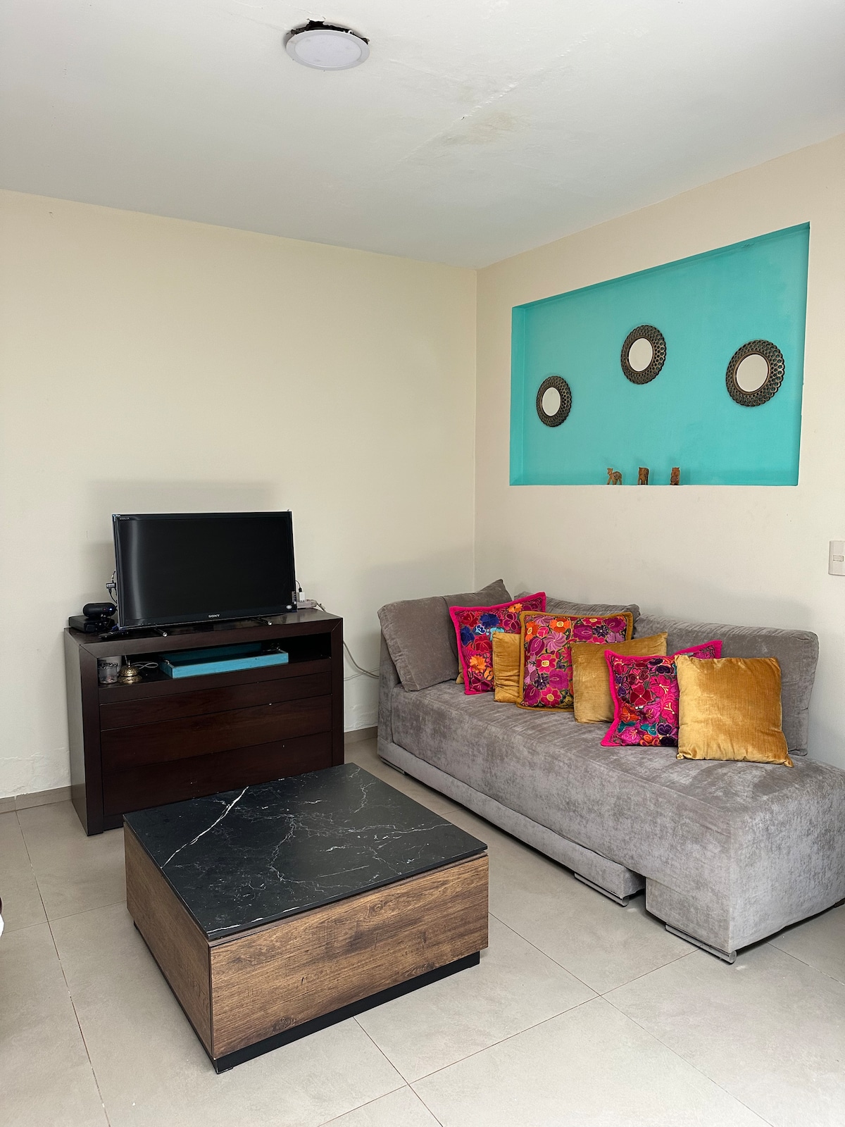 Departamento para 4 personas, una recámara matrimonial y sofá cama en la sala (matrimonial) espacioso y cómodo !! Moderno y acogedor. Cuenta con cocina equipada para cuatro personas, ducha, amplia, un televisor y Wi-Fi .no apto para niños pequeños, pues tiene una escalera peligrosa hacia el cuarto de servicio, excelente ubicación!!