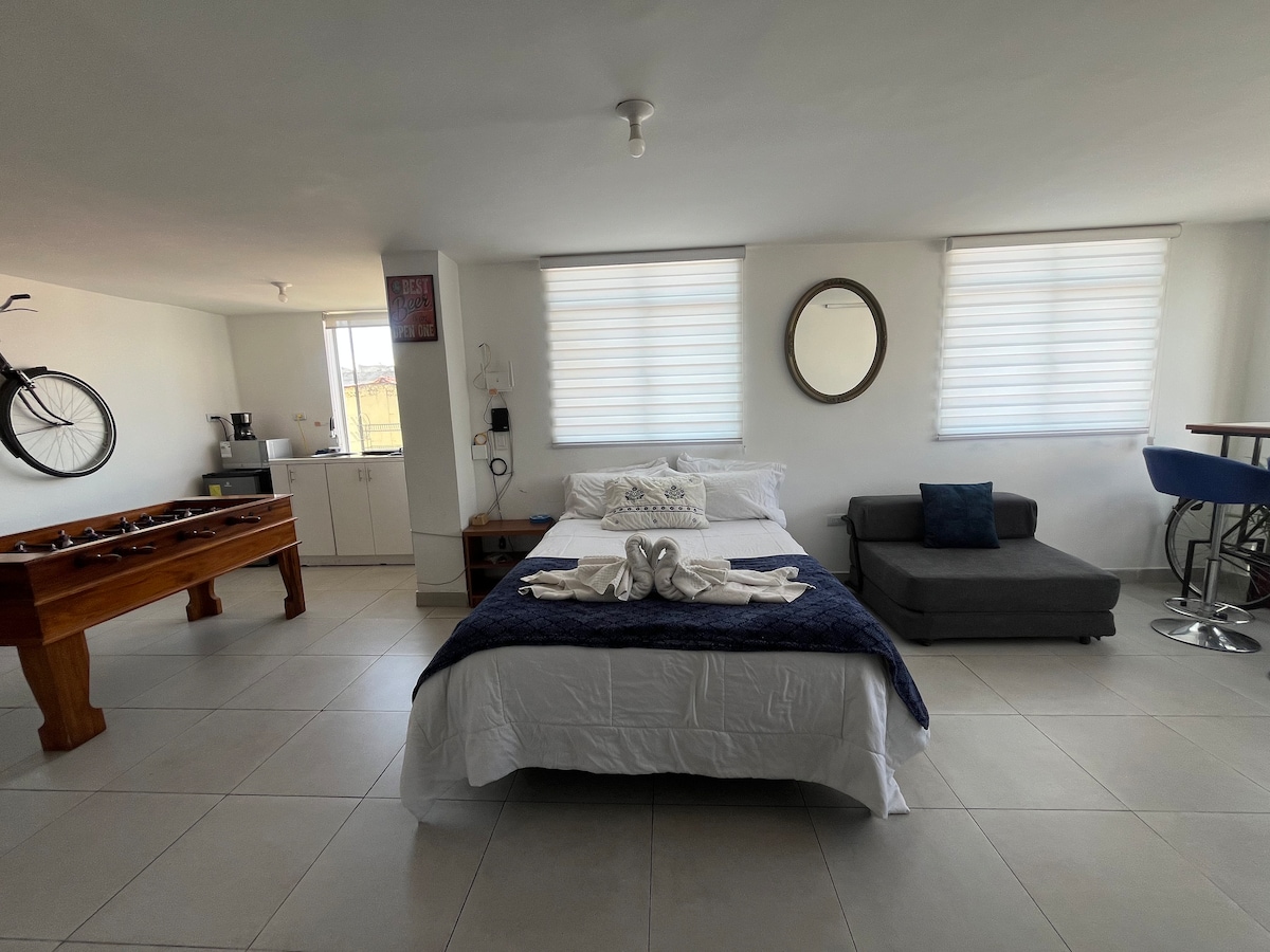 Discover Quito from this modern studio. Located on Av. República de El Salvador, just one block from La Carolina Park, in the exclusive area of the city. Surrounded by restaurants, supermarkets, and banks, everything is within reach: • 4 minutes: La Carolina Park • 11 minutes: Megamaxi • 15 minutes: Quicentro Shopping The studio offers high-speed internet and a dedicated workspace. The building features a pool, jacuzzi, sauna, steam room, gym, and 24/7 security. We speak English if needed.