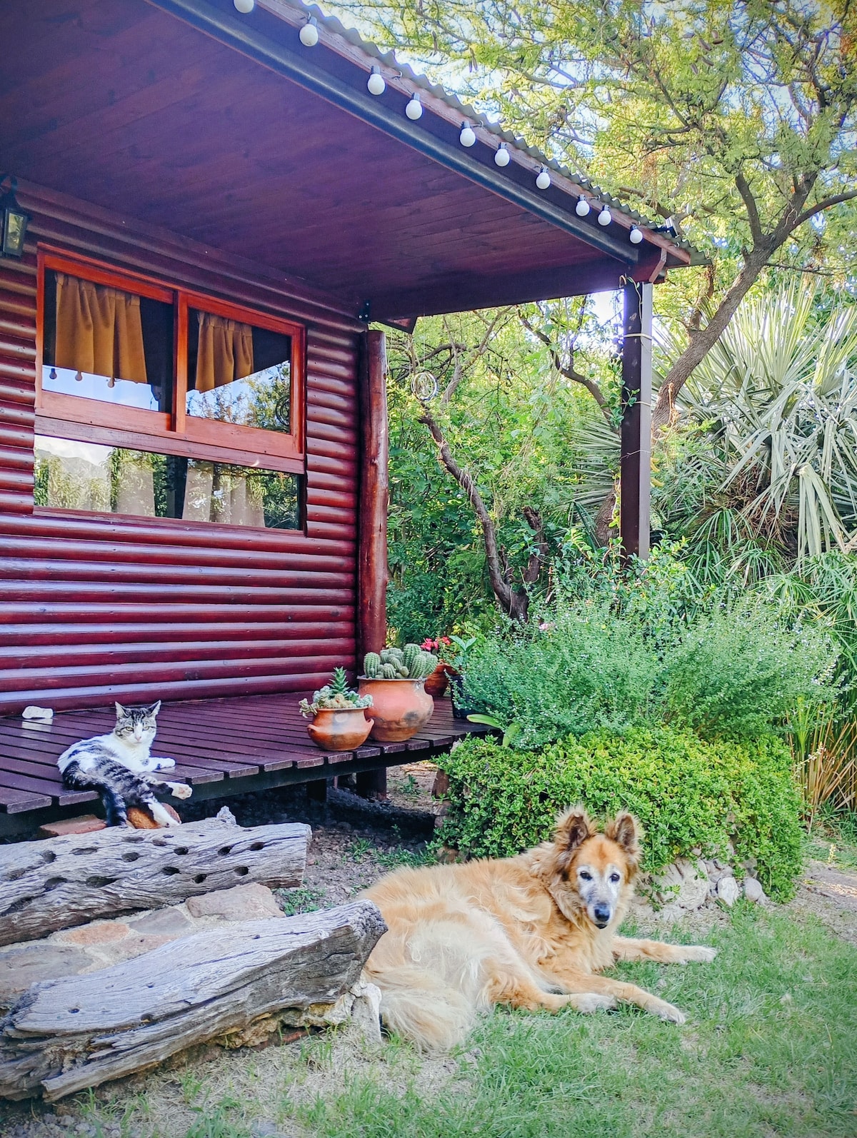 Jardín Dorado te ofrece un lugar para tu descanso, en un predio parquizado de 6000 m2; donde puedes relajarte con una clase de yoga, en la piscina, bajo la sombra de los árboles autóctonos, en el jardín o en la cómoda cabaña con su confortable living disfrutando del aire acondicionado, TV streaming y WiFi La Armonía es la nota tonal de lugar