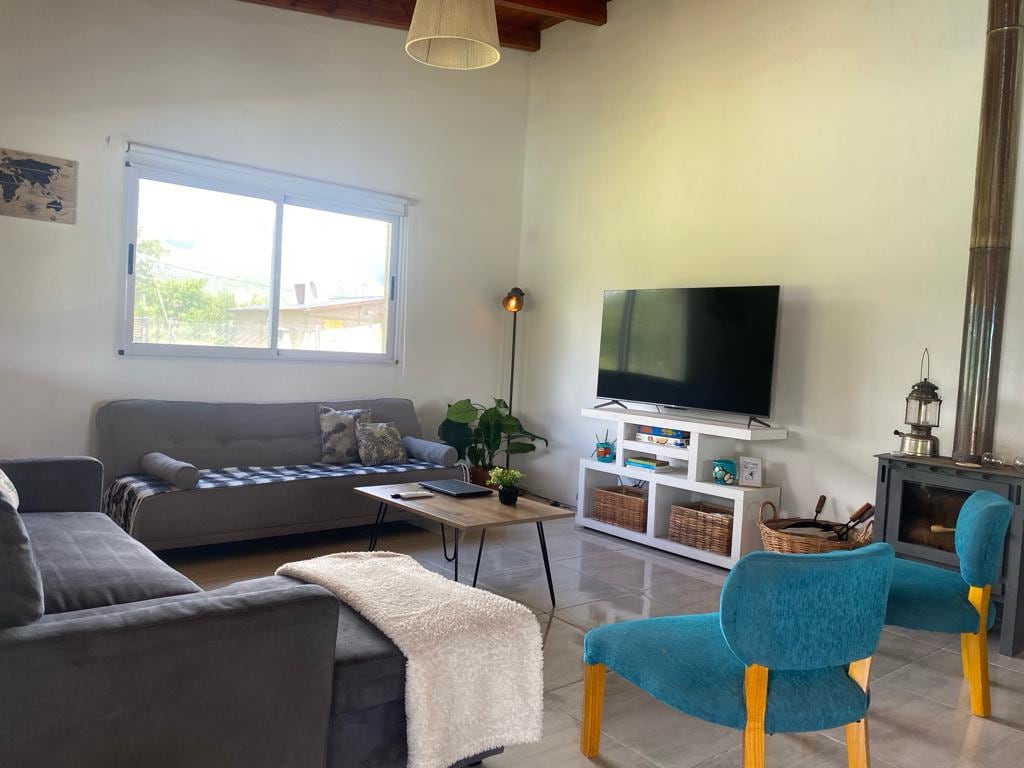 Es una casa soñada sentir que estas en un lugar único, decorado con un sentido y orientación a la calidez y el buen gusto de una casa de campo , cuenta con una habitación cama king TV baño en suite con jacuzzi otra dos camas plaza y media segundo baño con servicios , 2 aires acondicionados WiFi, Flow , Tv living 50 pulgadas quincho con asador , cochera cubierta cocina con horno electrico , anafe a gas , microondas y bajilla !Crea recuerdos inolvidables en este alojamiento único y familiar.