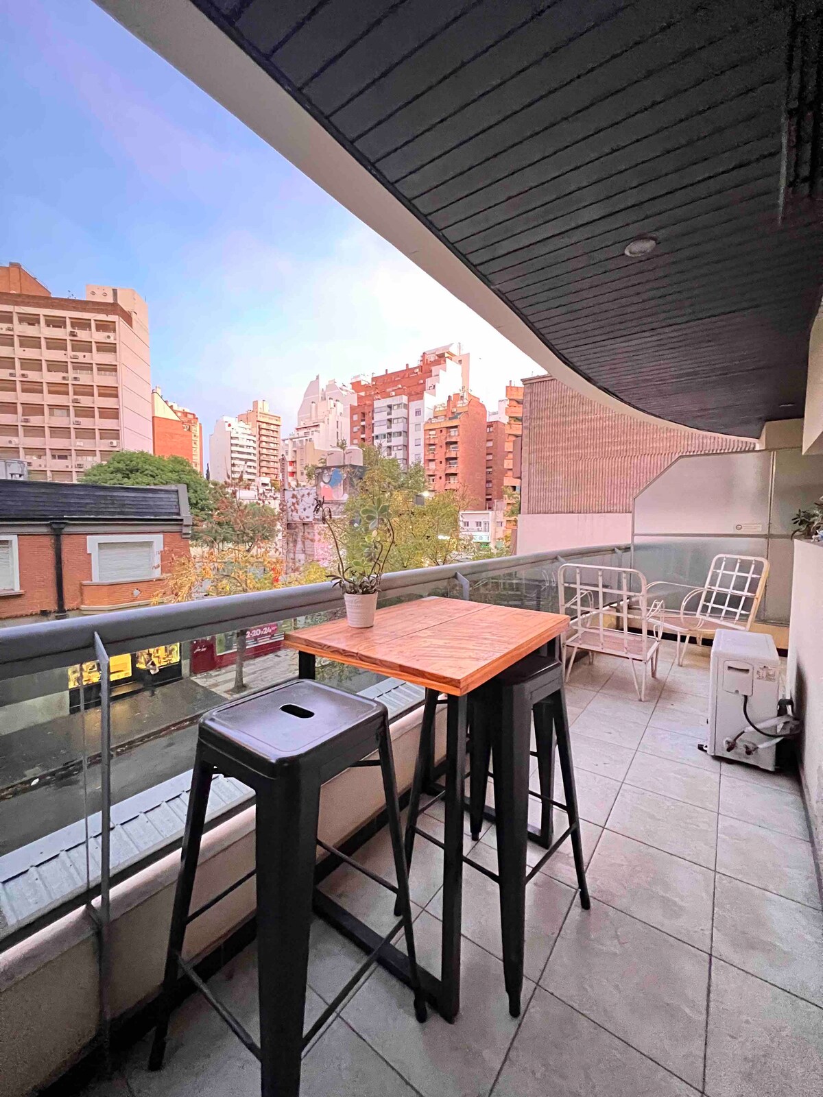 "En el piso 8, con vista a un pulmón verde, este departamento combina colores vivos y detalles rústicos. Muy luminoso y con ventilación cruzada, ofrece ropa de cama de calidad, infusiones, y todos los electrodomésticos esenciales. Ambos ambientes cuentan con Aire acondicionado frio-calor y Smart TV con Netflix y Disney+."