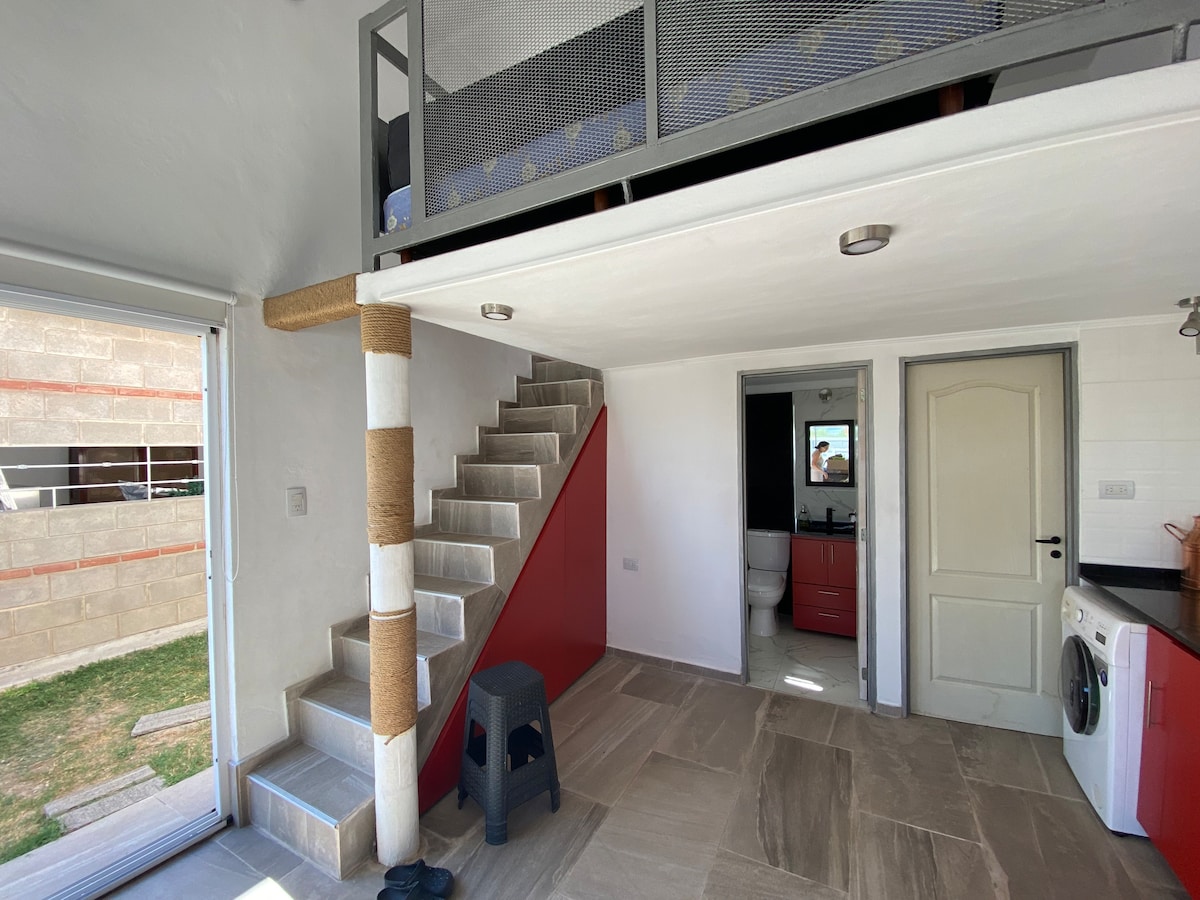 Relajate en este espacio tan tranquilo y elegante. Departamento entero, 1 dormitorio con cama doble, 1 cama adicional en la sala. Living cocina y comedor en concepto abierto. Baño zonificado. Jardín interno privado de césped y con sombra. Cochera propia. Capacidad máxima 3 personas. Zona estratégica: acceso directo a la Av. de circunvalación que conecta con varias localidades turísticas (Carlos Paz, Alta Gracia, Jesús María, Cosquín...Rutas nacionales).