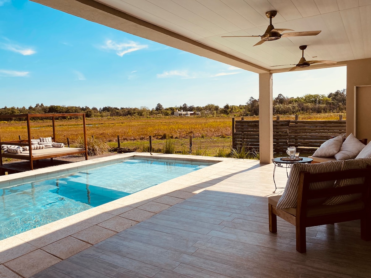 Divertite con la familia en este alojamiento con estilo. Hermosa casa quinta, con piscina, frente a la Laguna Brava, rodeada de naturaleza, inmersa en la reserva natural ecológica, donde estarás en contacto directo con la fauna y flora única que te brinda este paisaje, lo cual hará que tu experiencia sea inolvidable. Casa quinta de uso exclusivo de las personas alojadas. No se permiten eventos.