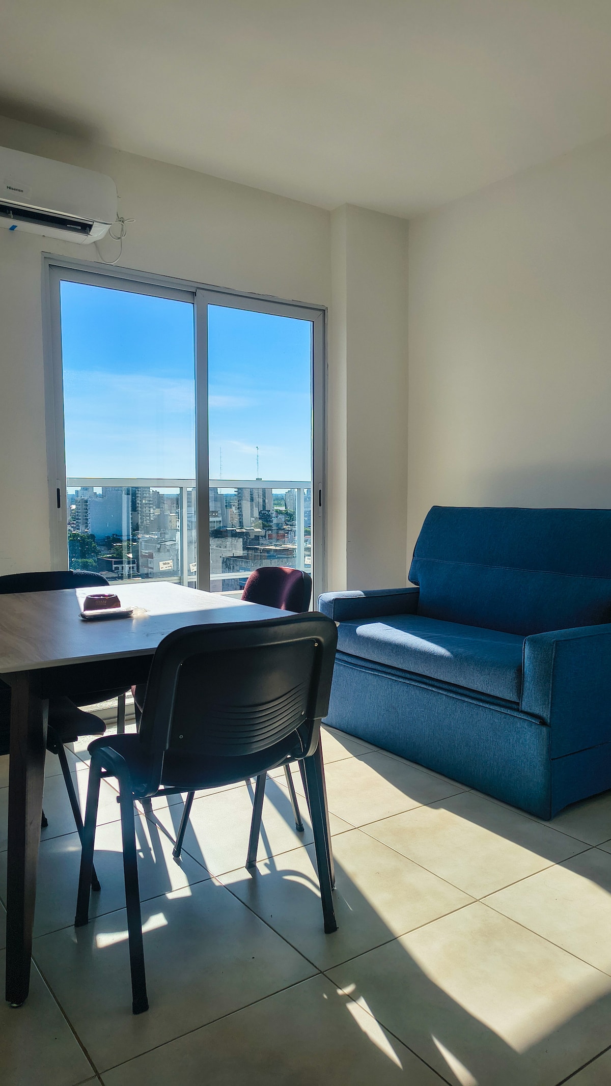 El apartamento se encuentra en el piso 12 del edificio el Tigre. Ubicado en el barrio Camba Cua a pocos metros de la costanera, el puente general belgrano y el río Paraná. Cuenta con 2 ambientes , el living/ comedor es muy amplio con una mesa , aire ,sillón y tv 55’. La habitación cuenta con cama matrimonial amplia , aire y tv 40’.