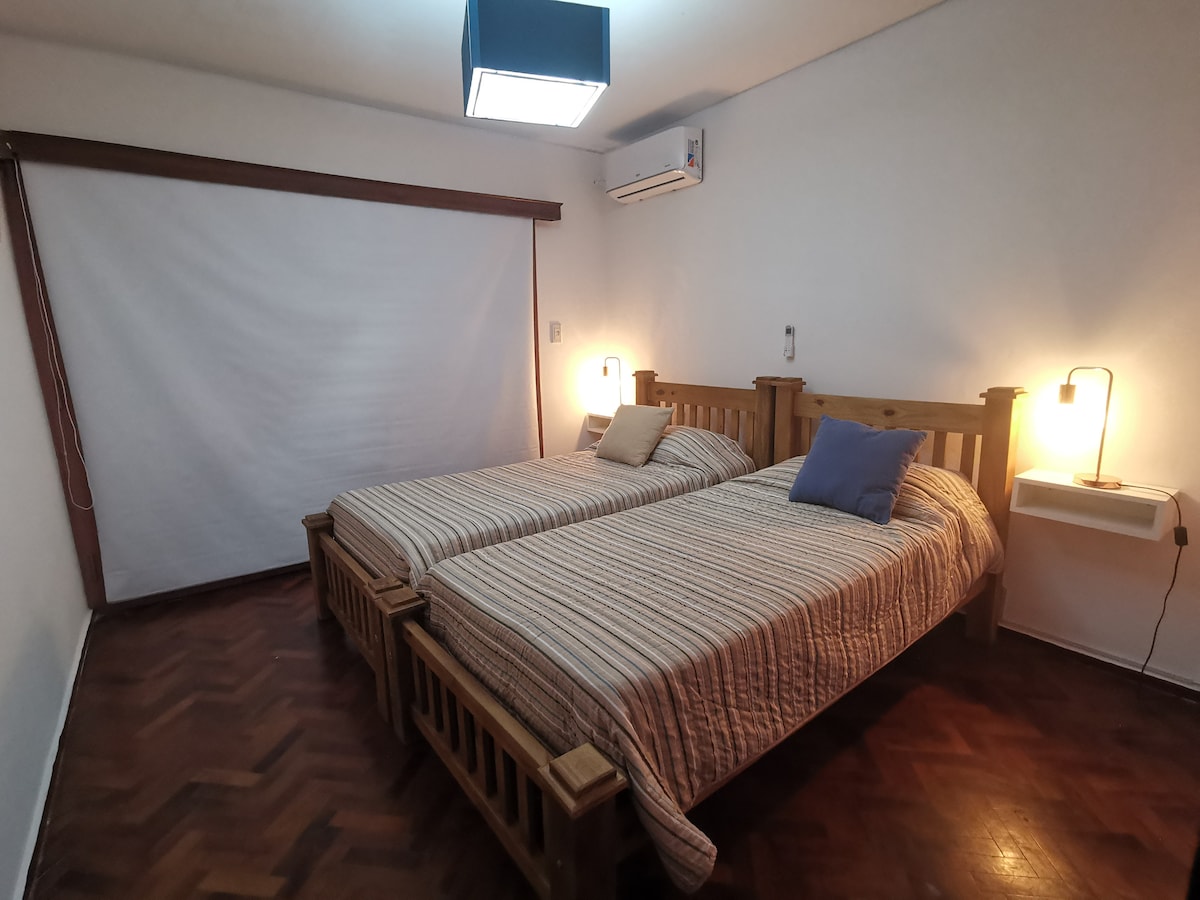 CASA COMPLETA DESAYUNO o MERIENDA INCLUIDO (excepto los dias 25/12, 01/01 y 01/05) Podran elegir entre 4 opciones -ESTACIONAMIENTOS GRATUITOS y TECHADOS: para un auto en la propiedad, y para un segundo auto, en una cochera a 50mts. - living-comedor, sofa-cama, smart TV, patio con parrilla - cocina-comedor con heladera, microondas, tostadora, pava eléctrica, cafetera, utensilios, - baño visitas y principal - 3 dormitorios: 1 cama queen y 4 camas individuales c/uno, todos con aire acondicionado