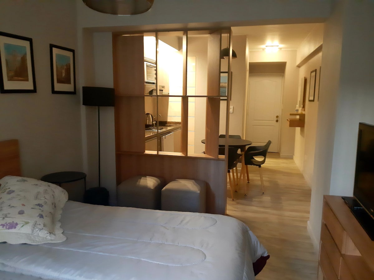 Departamento hermoso y funcional. Muy cerca de las principales avenidas comerciales, como los paseos gastronómicos . A 200 mts del paseo Alameda, donde se encuentra alquiler de bicicleta y acceso a todos los medios de transporte. Su equipamiento es a Estrenar.!! Smart tv Android, con canales digitales, conectado a wifi. Aire acondicionado FRIO CALOR Una hab. matrimonial y otra hab. con dos camas de una plaza. Baño y Antebaño. Luminoso balcón. Cochera cubierta Gratis a 100 mts Automatizada