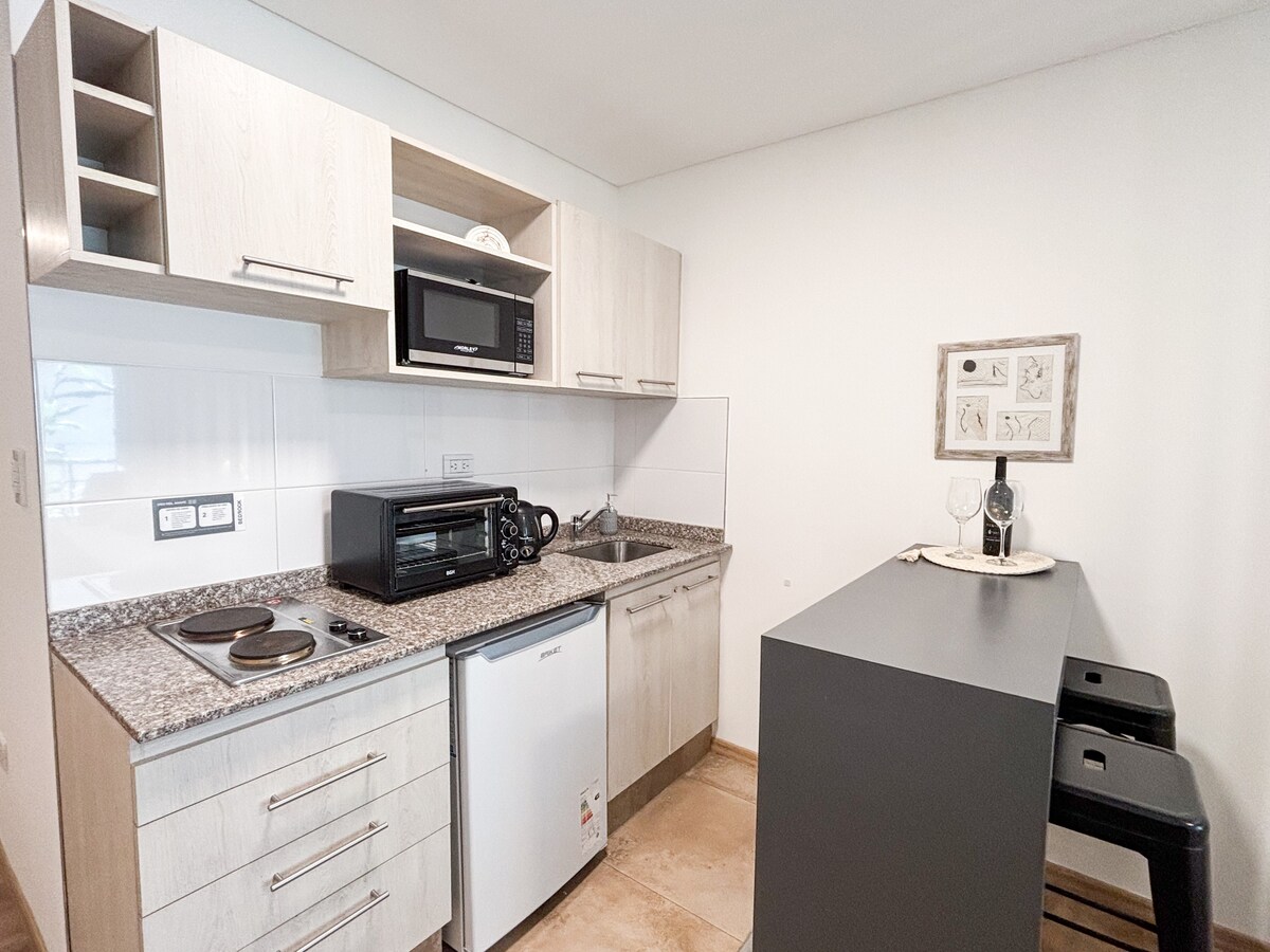 Descubrí nuestro monoambiente especialmente diseñado para una estadía cómoda y sin complicaciones. Equipado con cama Queen, aire acondicionado frío/calor, Wi‑Fi de alta velocidad, Smart TV y kitchenette con heladera y anafe, cuenta con ropa blanca completa y baño privado. Ideal para una experiencia de vida moderna y práctica, cerca de zonas gastronómicas y con acceso a piscina, gimnasio, coworking y seguridad las 24 hs. Perfecto para nómades digitales, estudiantes o profesionales en tránsito.