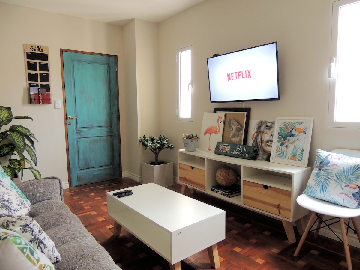 Cómodo departamento céntrico, ideal para familia, a 5 cuadras de distancia de la Plaza 9 de Julio, con cochera (solo para autos de porte chico, camionetas no) El departamento cuenta con cocina equipada, living-comedor, TV con Netflix y Starplus. Wi-Fi y ambientes acondicionados. Una habitación con cama matrimonial y otra habitación con dos camas individuales. El departamento cuenta con cochera