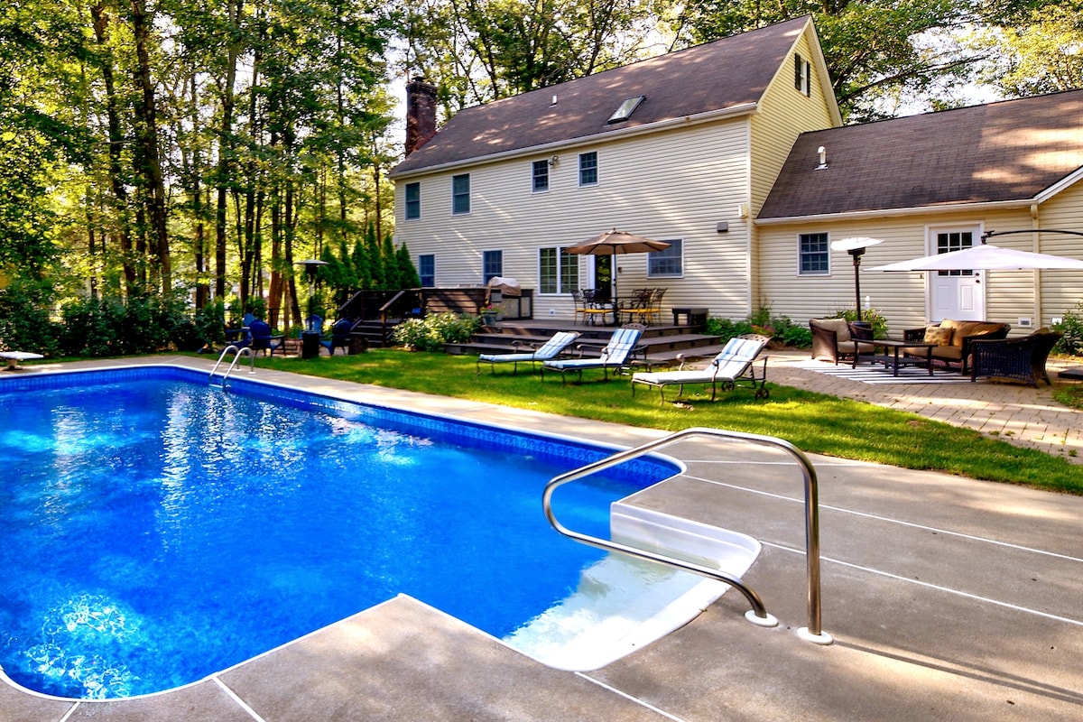 Everything you need for a wonderful vacation including gorgeous heated pool (new pool liner and heater 2020), outdoor kitchen with gas grill and refrigerator and patio with dining and casual seating, outdoor fire pit and landscape lighting at night. Indoors you have a wood burning fireplace, central AC, stainless appliances, hardwood floors, finished basement, and TV’s in every bedroom, all in a nice neighborhood setting 5 minutes from downtown Saratoga, golf courses,tennis and walking trails!