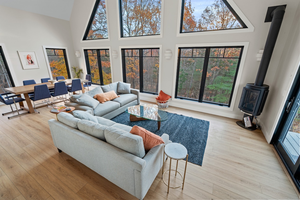 The Wild Host presents, The Hunter Gatherer in Hunter, NY. Perfectly designed for families and groups, this 4-bdrm, 3-bath lux home combines modern comfort with stunning surroundings. Walkable Main St location w/ sweeping views of Hunter Mtn. Sip coffee and soak in the hot tub by the river or unwind in the cedar sauna. Just 1 minute from the entrance of Hunter Mtn Resort, you’ll have easy access to skiing, snowboarding, hiking, festivals, and year-round Catskills adventures.
