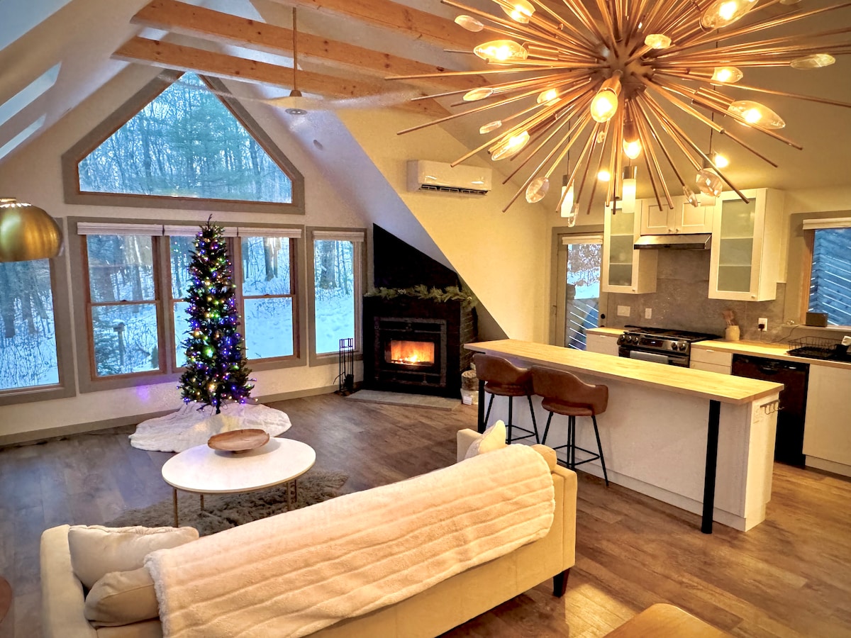 The Hygge Loft: a midcentury modern-designed cabin nestled among 70 acres of privately-owned forest with rivers & hiking trails. Enjoy sipping an espresso or wine while listening to vinyl records, cozied up by the wood-burning fireplace. Take a walk in the forest to the river or stargaze by the firepit on the private deck. Indulge in a luxurious bath or snuggle up in the ultra comfy king-size bed with views of treetops and sky all around. It’s the kind of place you’ll never want to leave!