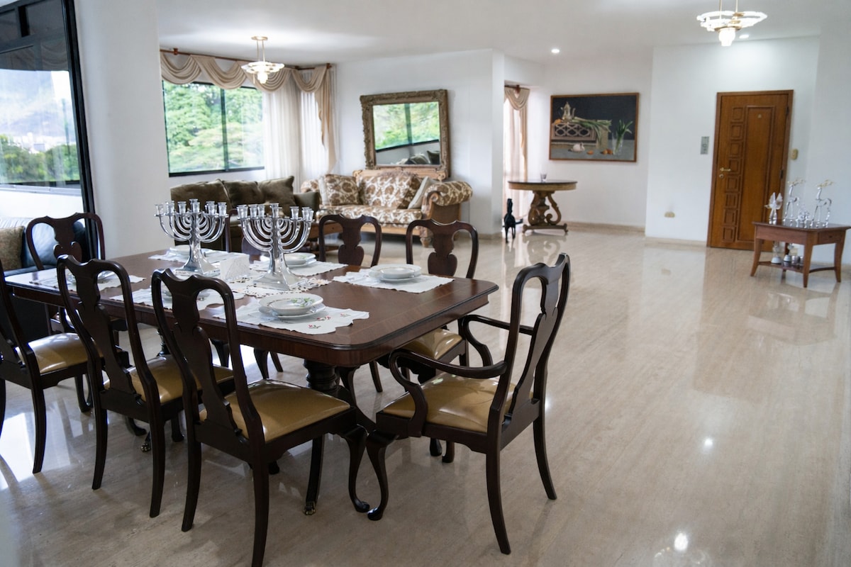 Disfruta de un lujoso apartamento de un piso 12, bellamente decorado con muebles al mejor estilo Luis XV, en una amplia área común con balcón para degustar el té admirando el imponente y majestuoso Parque Nacional El Ávila, de donde vienen exóticas aves, destacando las famosas guacamayas de vistosos colores. Adicionalmente los huéspedes pueden contar con una cocina equipada con pantry para comer. El lavadero cuenta con secadora eléctrica y lavadora automática. WiFi libre las 24 horas