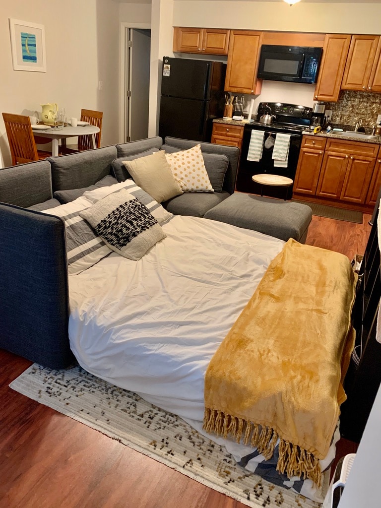 High-end suite with secure on-site parking, kitchenette with microwave, office desk, comfy king sized bed. We allow early check-in (8am) & late check-out (4pm) with keyless entry. No crazy rules or cleaning procedures - you get all the comforts of a hotel with homey touches of amenities: toiletries, chargers, high-speed WiFi and TV streaming. Steps away from Convention Center, National Mall and Smithsonian Museums, and other attractions.
