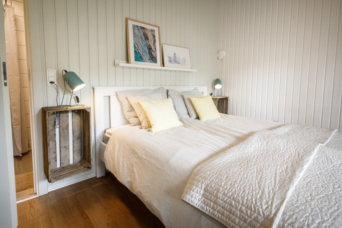 Our bright and simple double rooms are ideal for couples or friends seeking a peaceful base in the heart of North Bornholm's beautiful nature. The rooms are located in our atmospheric annex in the courtyard and feature practical amenities such as a washbasin, mirror, wardrobe, and a small workspace – perfect for both relaxation and planning your next adventure. Toilets and showers are located nearby in locked cubicles, ensuring both comfort and privacy.