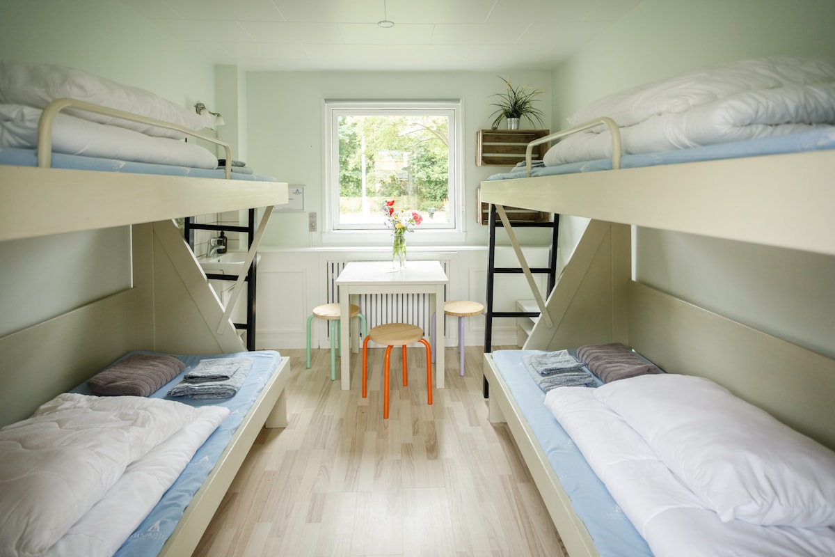 This family room has a shared bathroom and toilet near the room, a private entrance, smal table and smal chairs and 2 bunk beds . Ideal for families to enjoy peace and quiet in a safe environment Guests can relax in the garden or on the terrace, enjoy the outdoor fireplace, andthe outdoor seating and picnic areas. The hostel features a lounge, shared kitchen, outdoor play area, and mini golf. Additional facilities include bicycle parking, barbecue areas, and electric vehicle charging