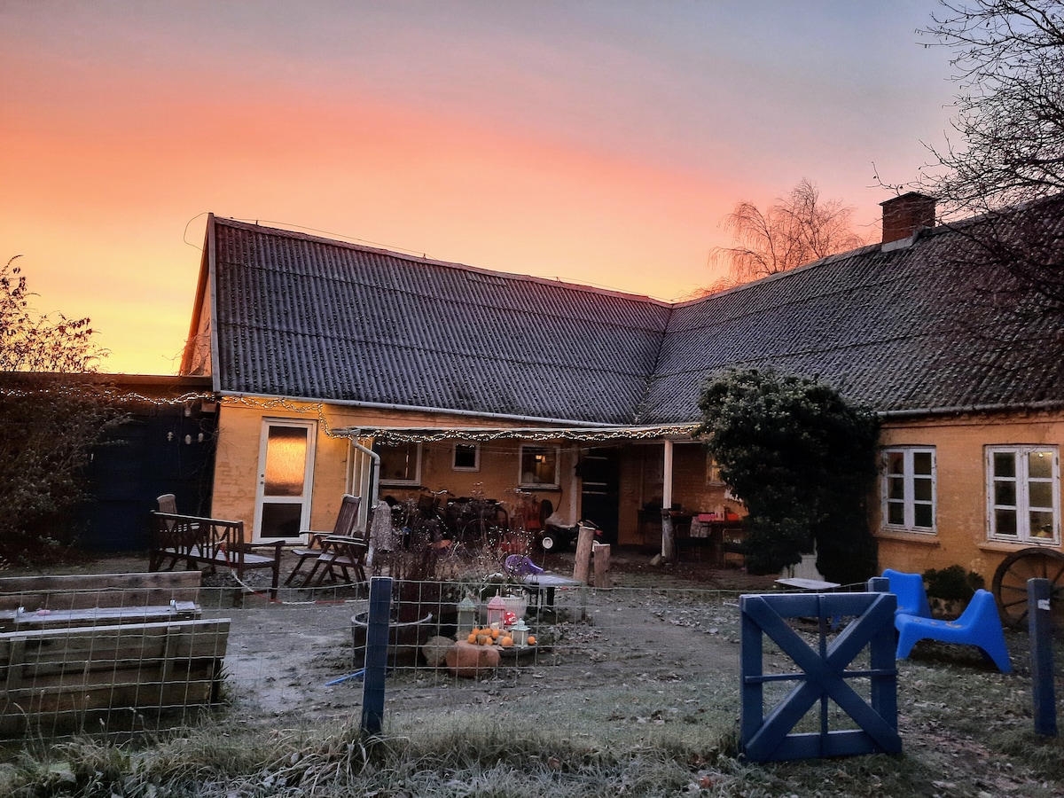 Kom væk fra det hele, når du bor på vores lille økologiske landsted. Selvstændig lejlighed med fuldt køkken og soveplads til 4-5 personer. Masser af dyr og natur lige uden for døren. Der går hunde frit omkring på ejendommen, nogle af dem er store.