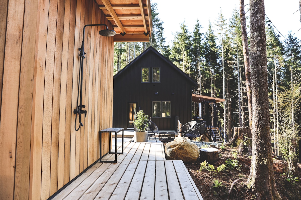 Nestled among the towering trees of Jordan River, BC, Woodshed offers a serene retreat. Clean lines, natural wood finishes, and minimalist design blend with the lush coastal forest. Expansive windows invite dappled light and frame uninterrupted views of evergreens, creating tranquility and connection to the outdoors. Designed to evoke calmness, the space balances warmth and simplicity, where the whisper of trees and distant ocean sounds set the perfect backdrop for rest and reflection.