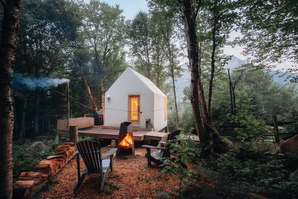 Évadez-vous dans cette micro-maison perchée au sommet d'une montagne et admirez la vue panoramique sur les sommets environnants à travers ses murs de verre. Détendez-vous dans le spa, accessible en toute saison, tout en profitant des plus beaux couchers de soleil. Découvrez ce trésor caché au cœur de la forêt boréale canadienne, alliant confort et fonctionnalité en toute saison. Une expérience intime et inoubliable, près de la ville mythique de Québec, classée au patrimoine mondial de l’UNESCO.