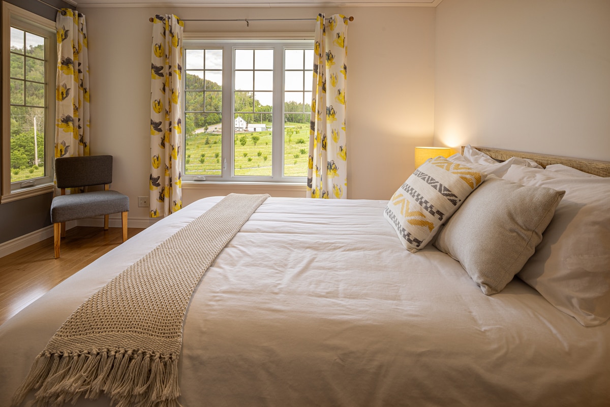 L'Érable' est une des 5 chambres de notre B&B ( # d'établissement CITQ: 210442) Max 3 pers. (1 lit double, 1 lit simple). Située au rez-de-jardin avec entrée indépendante, dans une grande maison en bois rond avec belle vue, à 2 km du parc de la Jacques-Cartier. Accueil dans une ambiance cordiale et conviviale. LE PRIX DE LA CHAMBRE INCLUT LE PETIT DÉJEUNER (sauf pour les bébés qui sont gratuits): Pain, confitures et yogourt faits maison + des œufs et fruits. Les animaux ne sont pas permis.