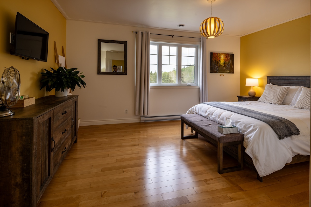 Comme une suite a l'hôtel, grande chambre privée avec petit salon et salle de bain complète. Insonorisée et climatisée, vous dormirez comme des bébés. Le cable et les canaux spéciaux, ainsi que le Wifi haute vitesse vous sont offerts. Également offert, un petit déjeuner pour commencer la journée. Maison ou il fait bon vivre, entourée de la nature boréale. Nous sommes a quelques minutes des grands artères. Grand terrain aménager en permaculture.