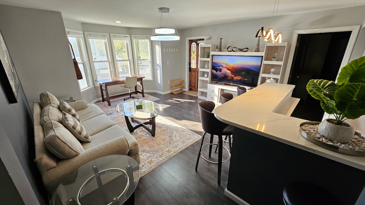 Enjoy your own special and separated section of this beautiful, modern colonial home. This beautiful home includes an oversize living room with a comfortable Queen Size sectional sleeper sofa, oversize Master Bedroom and very large bathroom with spa like jets. His and hers closets. Beautiful kitchenette. 50 inch T.V., Free WiFi. , comfortable dining and more, all for the comfort and convenience of our guests.