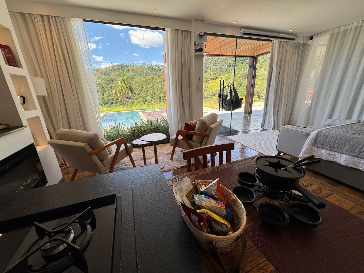 Em meios as montanhas de Serra Negra - SP, Dentro do Sítio Monte Belo. Para Relaxar , com luxo e sofisticação a apenas 5 minutos do centro da cidade. Conta com: Vista 360 das Montanhas Lareira externa e interna, Piscina climatizada, Banheira aquecida, com hidro, Área de churrasco, projetor de 84” Som de cinema, Chuveiro p/ 2 com vista Cafés locais para degustação gratuita dentro do chalé. Tudo PRIVATIVO Impressione seu Amor! Somos Pet Friend-Ly. Nao aceitamos Criança