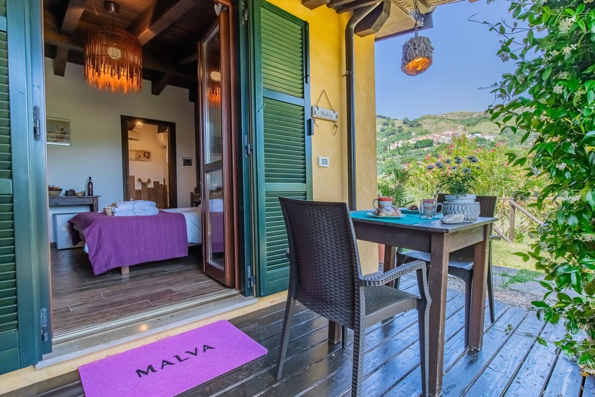 Ci piace definirlo “Nido d’amore” ideale per le coppie che vogliono godersi un week end romantico. L'appartamento è molto fresco nel periodo estivo, caldo e accogliente anche nei periodi più freddi grazie ad efficienti pannelli di riscaldamento. Si affaccia sulle numerose piante di Rosmarino che (soprattutto nel periodo primaverile) emanano il loro profumo e appagano la vista con i mille fiorellini color lilla. Ideale per chi ama passare momenti in totale relax sotto il fresco pergolato.