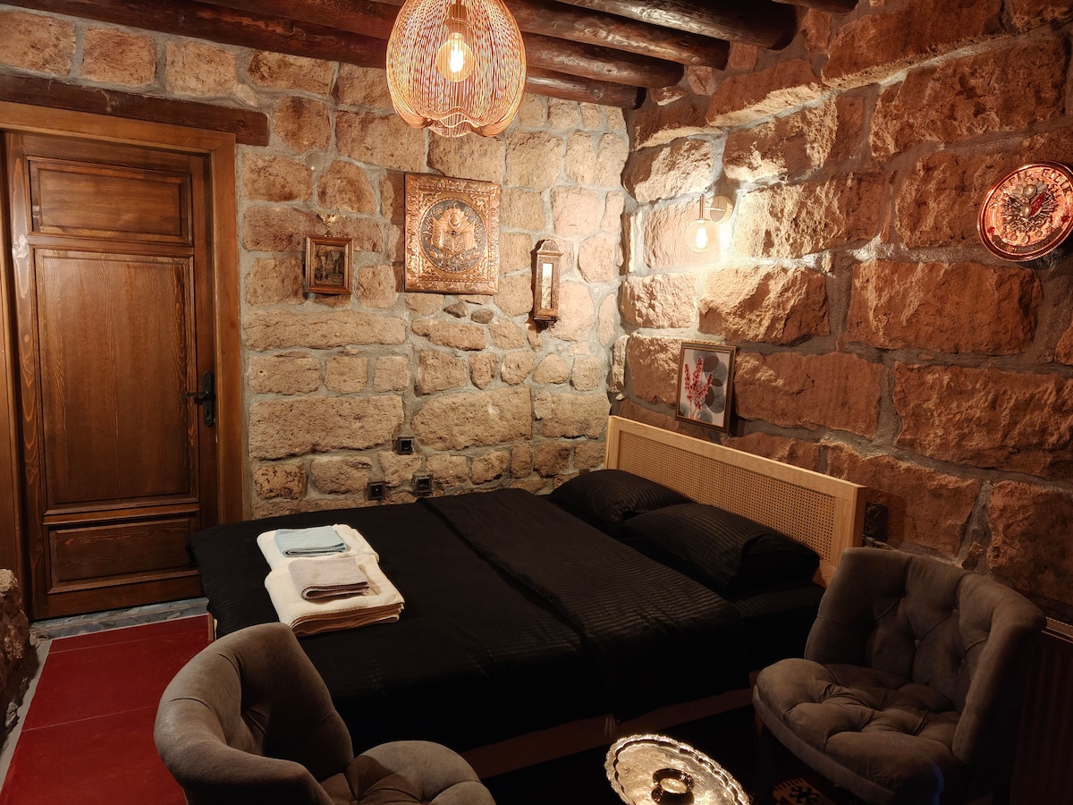 Our hotel is in Avanos, the artistic heart of Cappadocia, just 300 meters from the town center and next to the Kızılırmak River. Housed in a 130-year-old restored stone building, it offers a peaceful garden-view room perfect for families. Enjoy history, art, and nature all in one place.