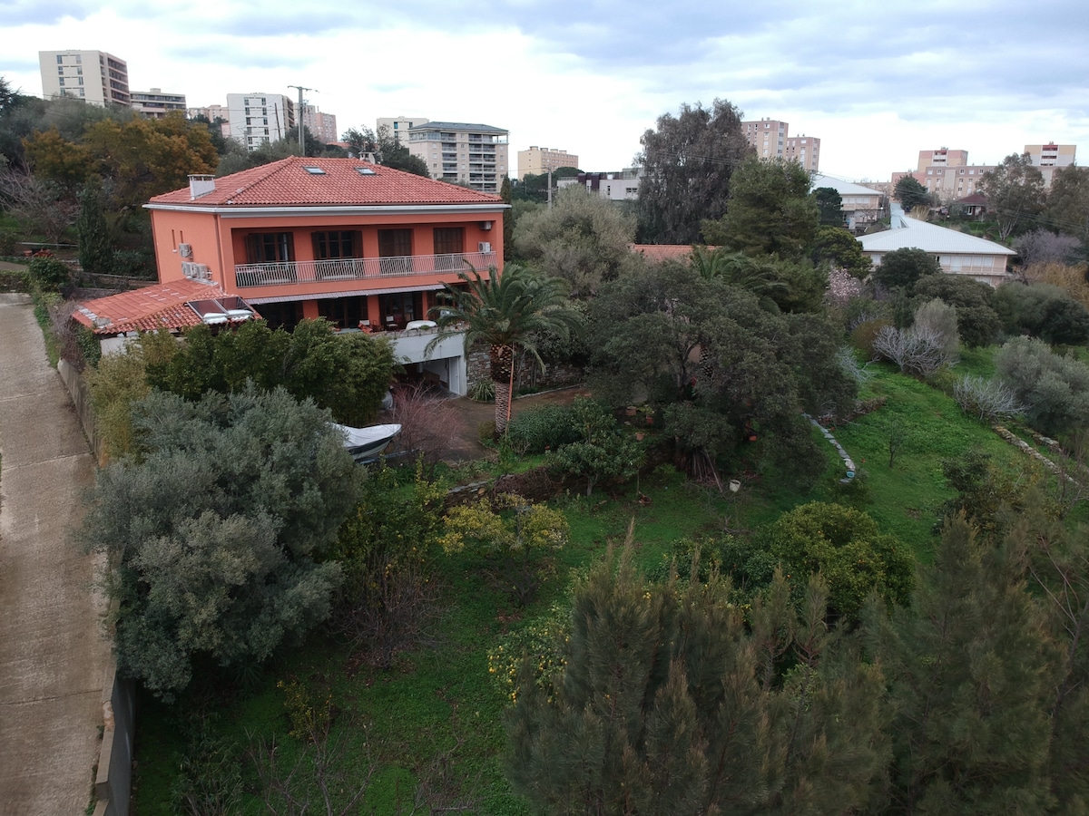 MEUBLÉ CLASSÉ TROIS ÉTOILES OFFICE DE TOURISME DE CORSE et CLEVACANCES. Situé à 5/10 minutes du Centre-Ville et de la plage de "L'ARINELLA". Situé dans un environnement sécurisé (video). Grande propriété, au milieu d'arbres centenaires, des fruits et des fleurs, est l'endroit idéal pour marcher, pour la réflexion. La veranda vitrée offre vue dégagée sur la mer. Parking privé Jardin clos, sécurité pour les enfants et les chiens. Piscine à usage partagée avec deux de nos studios