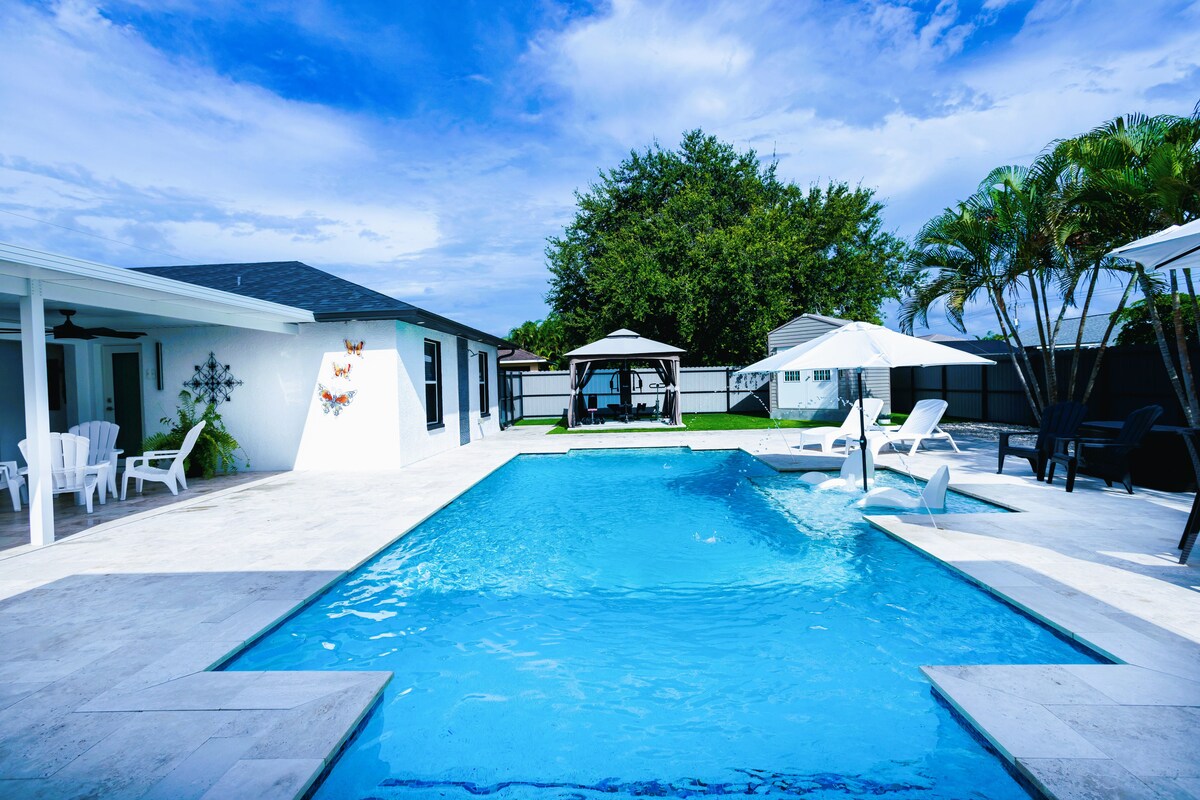 Welcome to Aqua Blue, the perfect getaway in sunny Fort Myers, tucked away in a hidden neighborhood. This coastal-styled home was just completely remodeled, offering a stylish, updated, and serene environment with plenty of common space for gathering with friends & family. The backyard is a true oasis offering an expansive patio, pool with screened lanai, a tropical cabana, cozy white lights, a fire pit and outdoor patio, & seating for your entire group to spend time relaxing and dining outside.