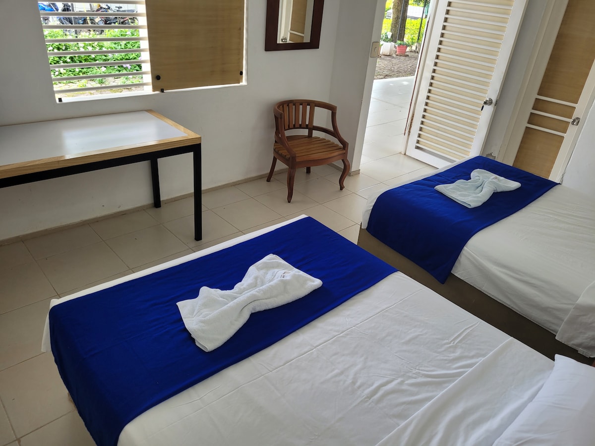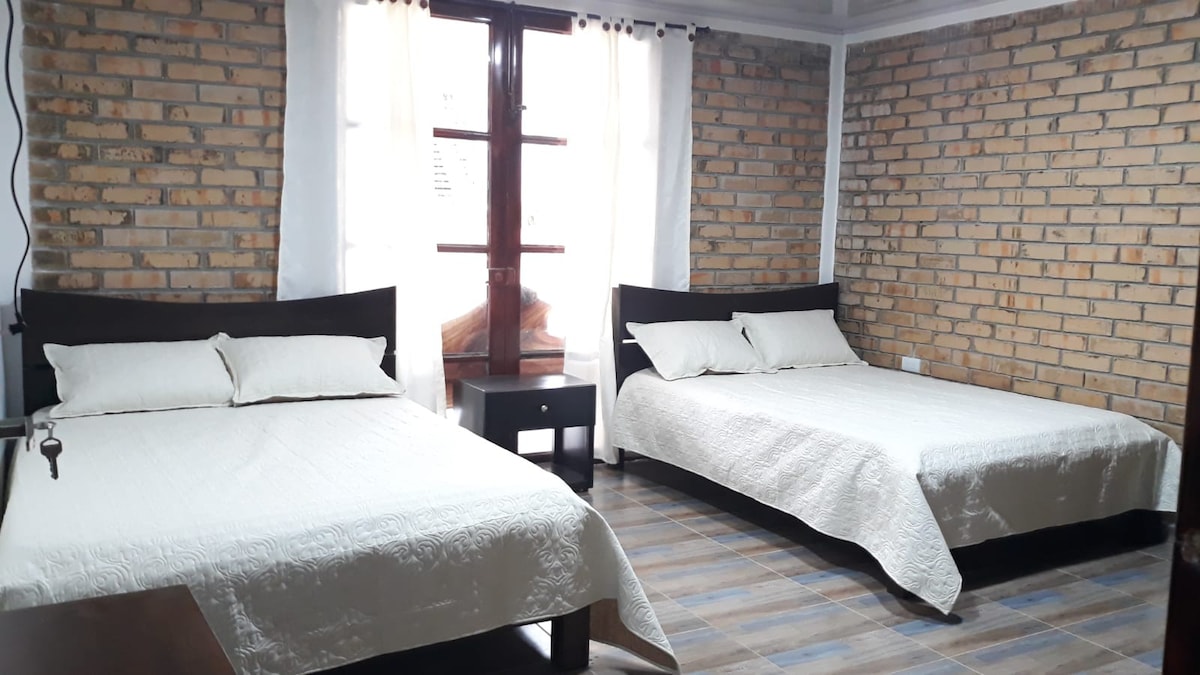 Este alojamiento único tiene mucho espacio para que disfrutes con los tuyos. amplia habitación con dos camas dobles, baño privado, agua caliente, tv smart tv, wifi, closet, primer piso. acceso a zonas comunes como sala, comedor interno, comedor al aire libre, andenes amplios, zonas verdes para camping y fogata, jardines, estacionamiento, etc.
