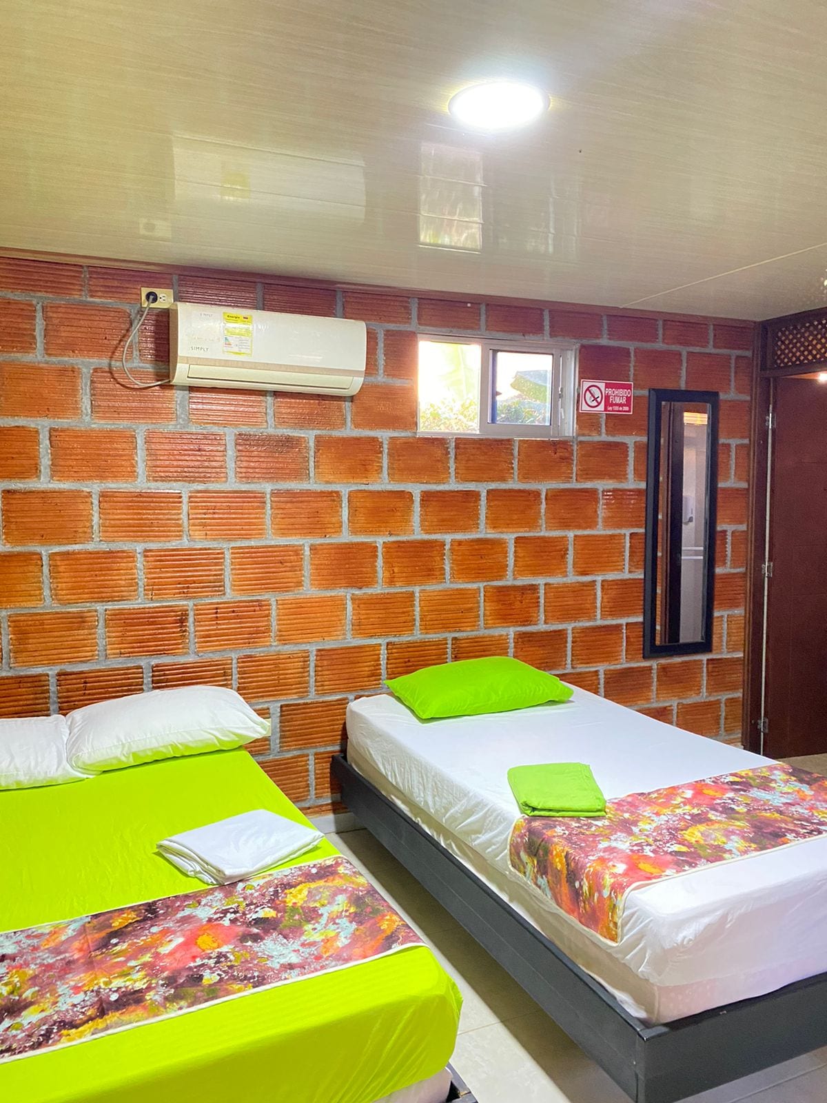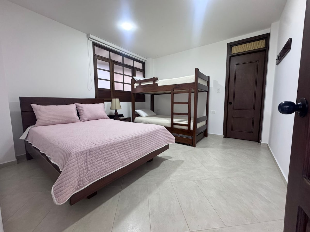 Cabaña independiente, dotada con 2 camas individuales, cama principal QUEEN y cama auxiliar tipo nido tamaño DOBLE. Baño privado con ducha y jacuzzi, artículos de aseo gratuitos, aire acondicionado, TV de pantalla plana, armario, zona de comedor y amplias zonas verdes y parqueo.