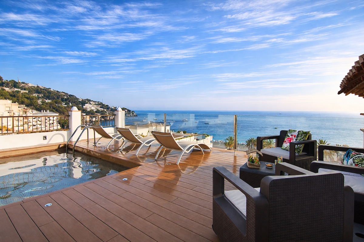 This stylish apartment is located in the the heart of Nerja and the beach can be found just around the corner. The house is completely renovated and is rented out fully equipped. Furthermore, on the shared rooftop terrace you can enjoy a modern lounge, a swimming pool with sun beds and astonishing city-, mountain- and sea views. In total, the guests of four luxury apartments have access to the rooftop terrace.