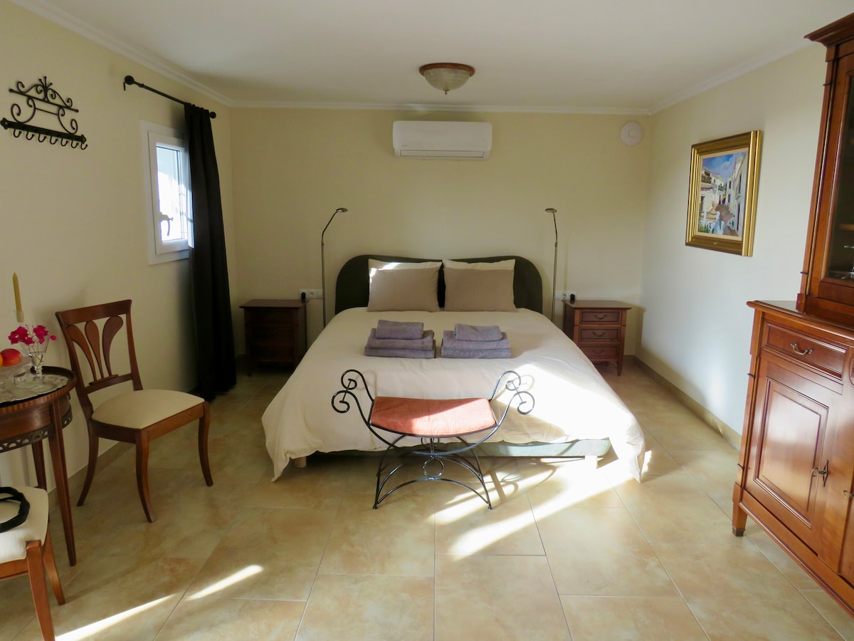This well-appointed lodging is situated on the top of Friglliana/Torrox road and boasts a magnificent view over Nerja and the Mediterranean Sea. Your accommodation is separated from the main house with a private entrance and your own secluded terrace with a spectacular view. It is a beautiful, big room, tastefully furnished with one double bed (or two single beds), two upholstered chairs and a table, and an additional armchair. You have your own en-suite bathroom and fully equipped kitchen