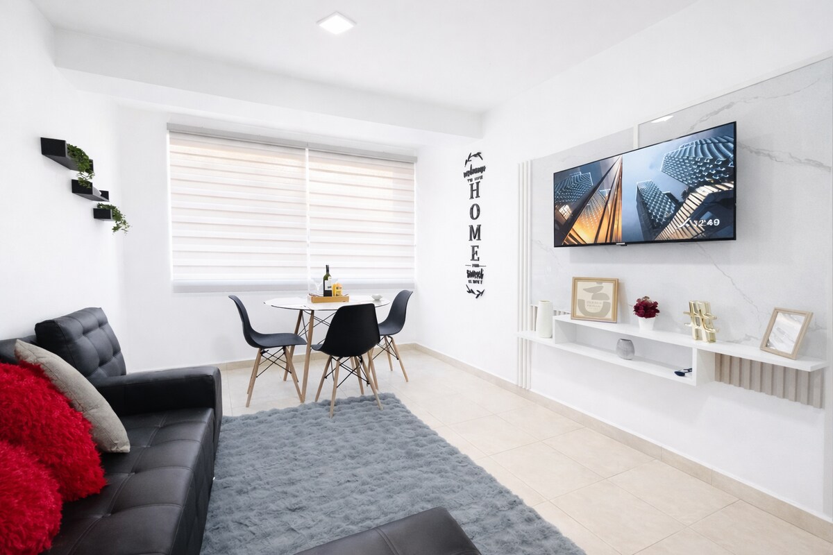 ¡Disfruta de una estancia perfecta en este acogedor apartamento para 4 personas, diseñado para ofrecerte confort y tranquilidad en el corazón de la ciudad! Cuenta con una habitación amplia con cama queen, además de dos sofá cama doble en la sala y cuarto principal, cocina equipada y baños modernos Ubicado en una zona céntrica, tendrás cerca panadería, mercados, farmacias y centro comercial. Incluye Wi-Fi de alta velocidad, aire acondicionado, Smart TV y todas las comodidades