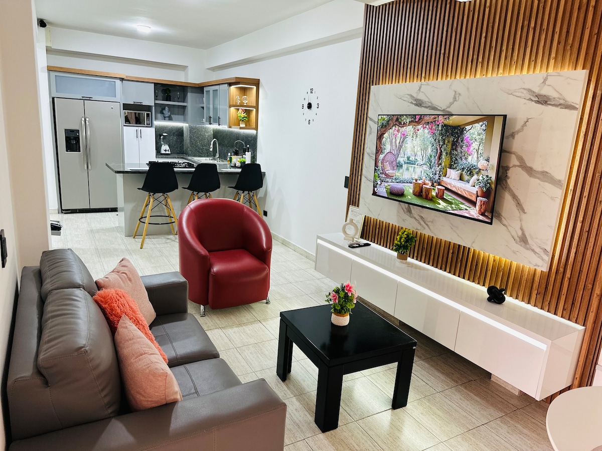 Disfruta de una experiencia con estilo en este alojamiento céntrico, con todas las virtudes de un hotel en la intimidad de un apartamento. Decoración única con todas las comodidades y servicios. Está diseñado para 1 hasta 3 personas, 1 habitación con una cama Queen y 1 sofacama matrimonial en la sala, con lencería de algodon Baño con diseño espectacular, toallas de alta gama. Cafetera, licuadora, horno microondas, cubiertos, vajilla, ollas, etc Tanque de agua planta eléctrica 50% Vigilancia 24h