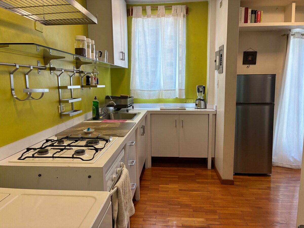 Muy céntrico. Suite cama king y otra matrimonial. Ambas con aire acondicionado; un baño principal y otro auxiliar. Cocina equipada, comedor, sala, TV panorámica, cable y wifi. Vista al Norte y Sur de Caracas Es un apartamento fresco y no tiene aire acondicionado en la sala-comedor-cocina. La electricidad y el agua son continuas, raramente fallan. Tampoco tiene secadora de ropa, pero si un tendedero también portátil. Estacionamiento gratuito en la calle y público/pagado a dos cuadras.