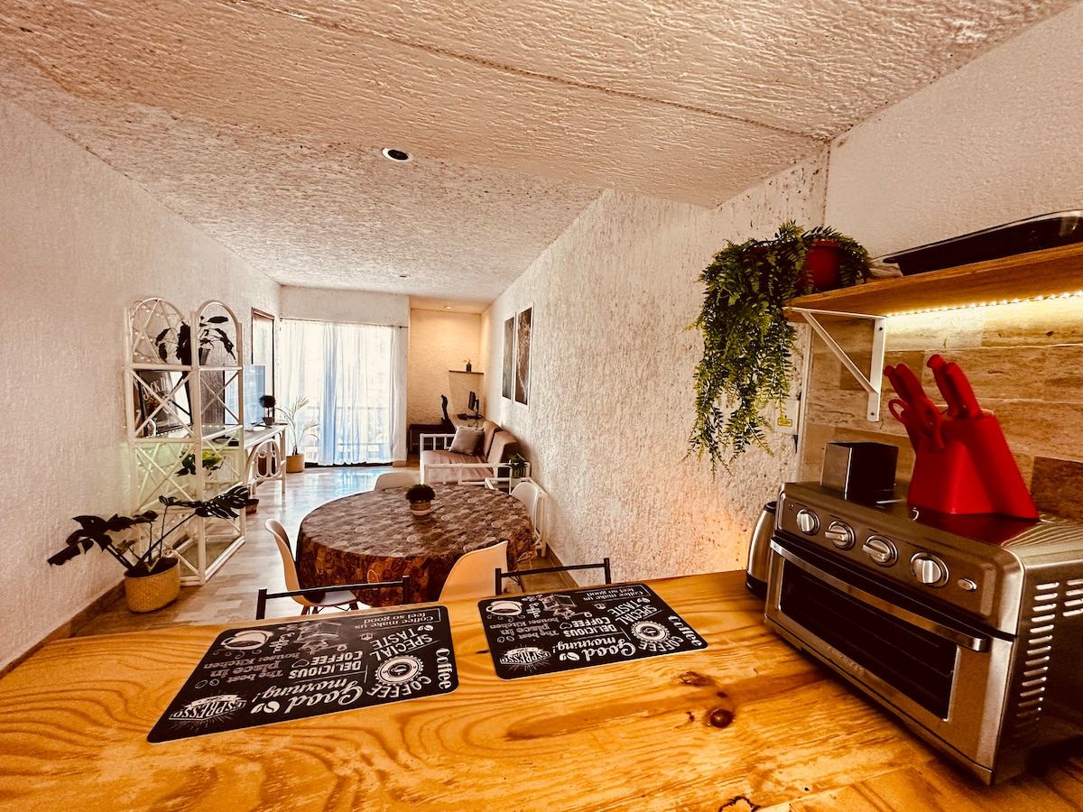 Precioso departamento equipado, muy cómodo y con alberca. Extraordinaria ubicación en la zona turística del centro de Cancún, en una calle tranquila y segura, a pocos pasos del Mercado 28 y de una avenida importante con acceso a camiones de zona hotelera para ir a la playa, por lo que es genial para movilizarse caminando o en transporte público... No necesitas rentar auto! Está cerca de todo! Restaurantes, bancos, lavandería, gimnasio, gasolinera, Oxxo, Walmart y el famoso Mercado 28!