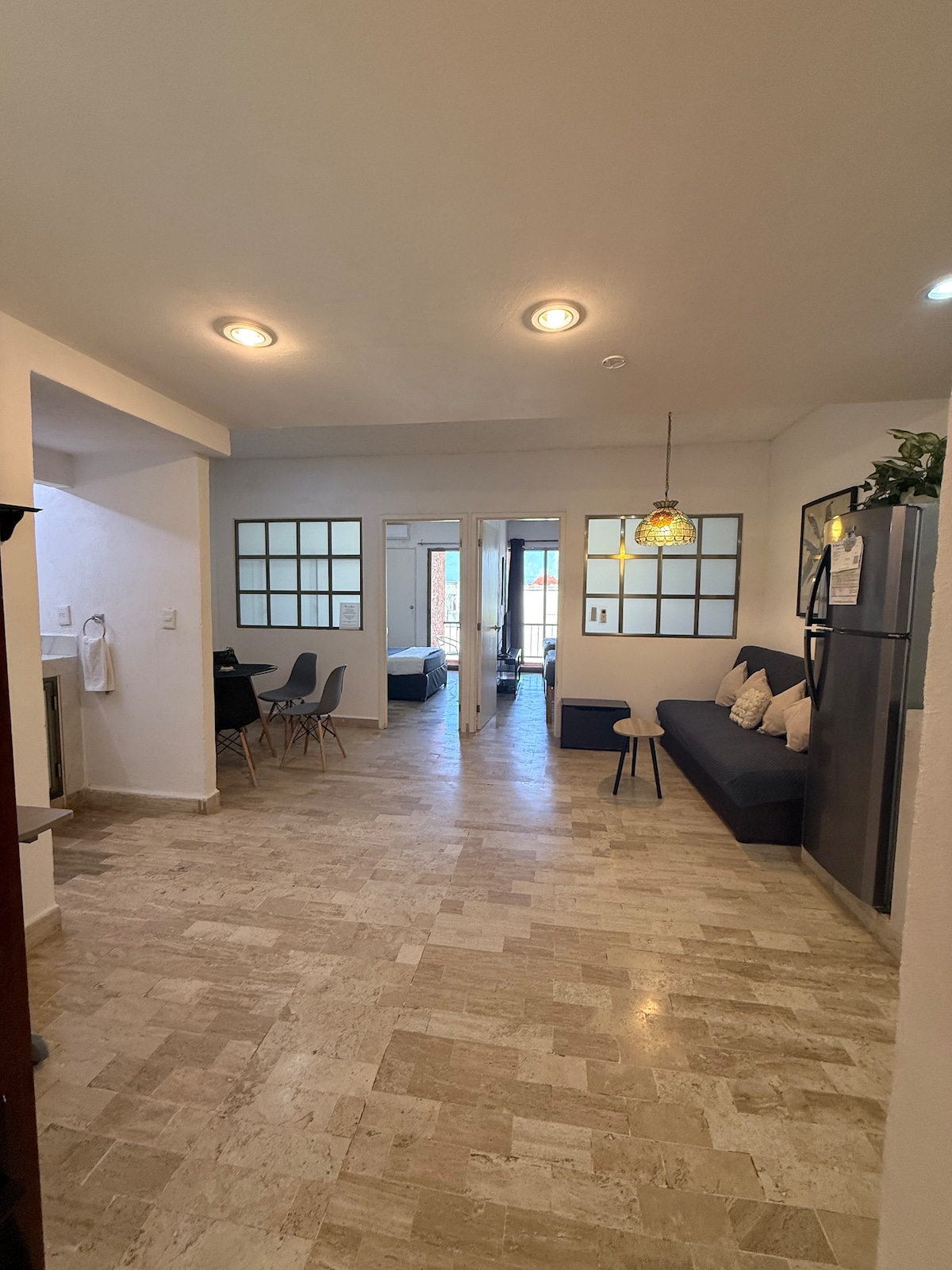 Recently renovated studio located right in the heart of the Cancun hotel zone, with a beautiful terrace and a breathless ocean view near by restaurants and night live fun activities. The studio has a modern touch with a beautiful terrace to spend time and enjoy the view and the ocean sounds with a cup of coffee, some wine or simply relax in the hammock. It has two queen size beds, a sofa type bed, a well equipped kitchenet and a dining table. It also has a flat screen tv and wifi service.