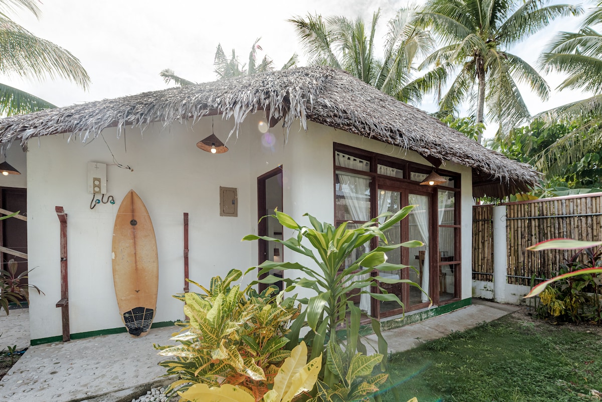 Wake up to the sunrise to the sound of the ocean waves lapping on the white sandy beach. Relax on the deck to hang out with your family. Personal maid service. On-site spa discounts. Walking distance to Cloud 9 with spectacular views of Rock Island, Stimpy's, and Jacking Horse surf spots. Full kitchen, AC, WiFi, hot shower, outdoor deck. Walking distance to cafes, restaurants and grocery. Airport transfers, motorbike rental, surf lessons, pilates, and massages can be organized.