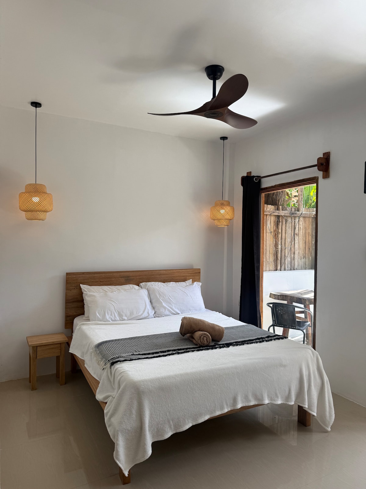 Modern and private apartment in Villa Palmora near Cloud 9 in General Luna, Siargao with palm and sunset views. King-size mattress, air-conditioning, fast fiber Wi-Fi, private balcony, and access to a spacious rooftop terrace. Strong water pressure, hot shower, fully equipped modern kitchen. Ideal for solo travelers, couples, or digital nomads seeking a quiet base in Siargao.