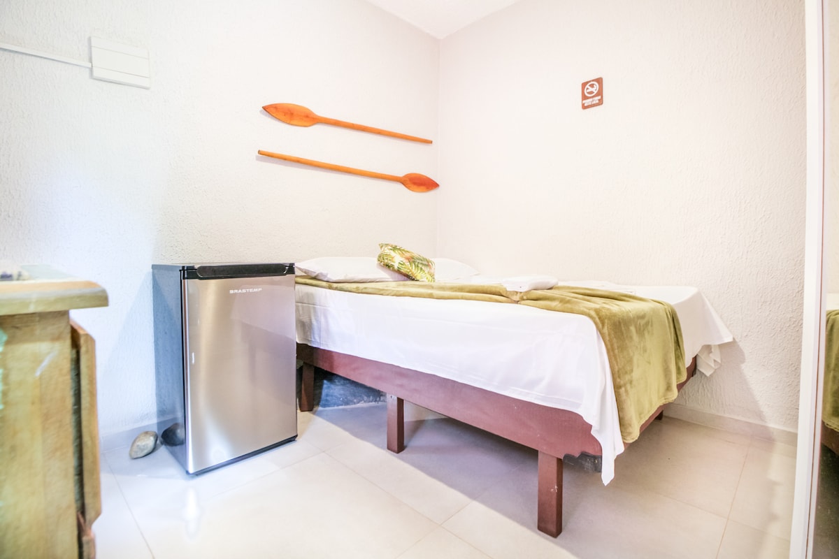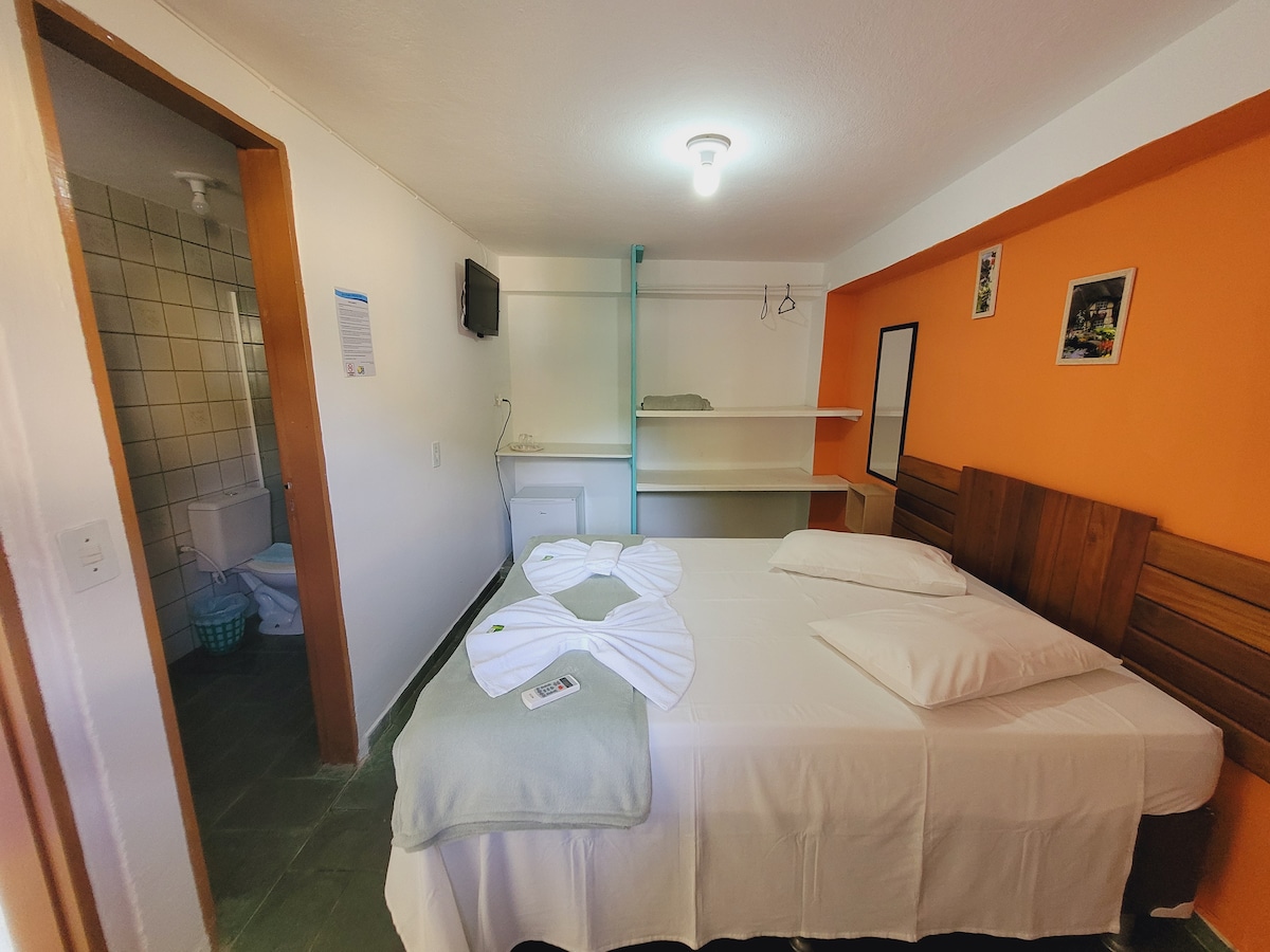 O Quarto Econômico, com 12 m², é compacto e acolhedor. Equipado com uma cama de casal, ar-condicionado, frigobar, Wi-Fi, ventilador de teto, enxoval completo e banheiro privativo com secador de cabelo. Acomoda até 2 pessoas.