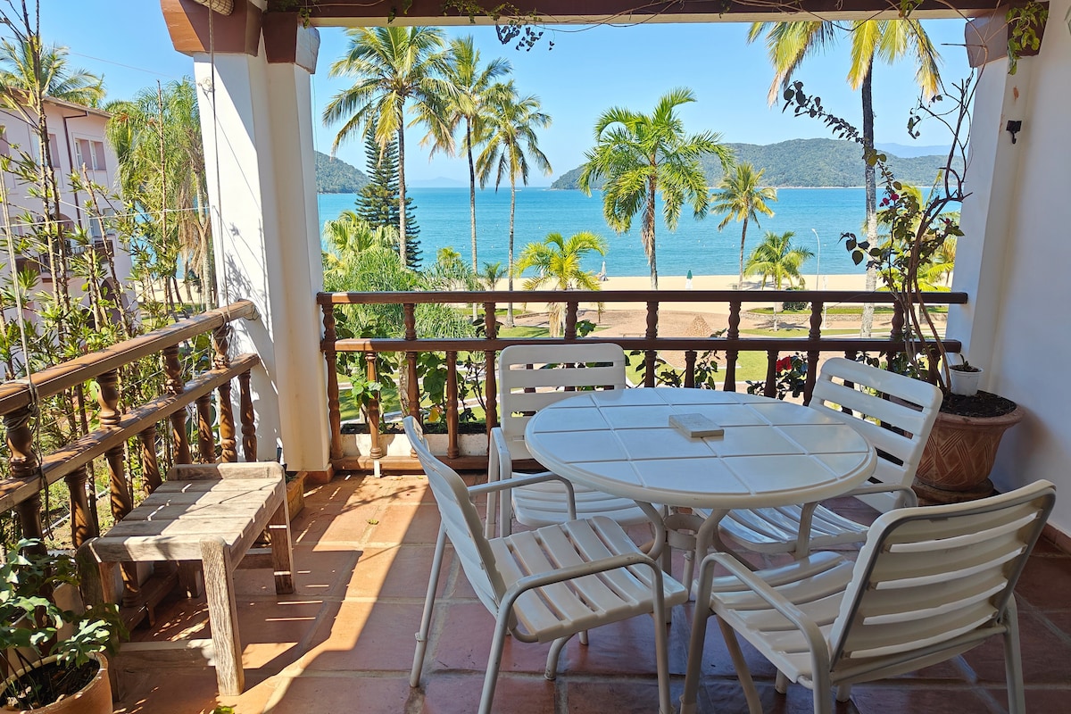 Condomínio Costa Esmeralda, pé na areia com acesso diretamente na praia, piscina aquecida com borda infinita com bar. Praia mais charmosa da região. Vista do apartamento para o mar, piscina, praia e Ilhabela. 01 vaga de garagem. Como serviço básico, se oferecem toalhas e roupas de cama ( travesseiros e lençóis) aos hóspedes.